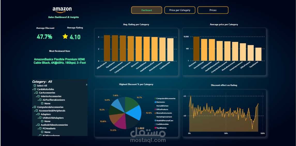 لوحة تحكم تفاعلية تعرض أداء المنتج بناء على تقييمات العملاء وتحليل المشاعر.