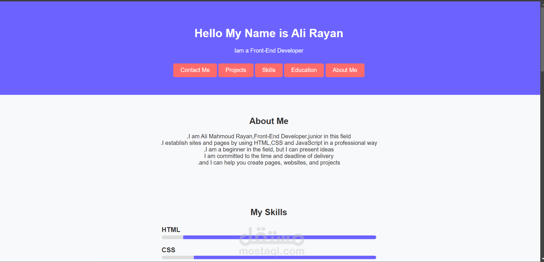 موقع ويب شخصي يعرض أعمالي ومهاراتي كمطور ويب. يتكون من عدة أقسام، مثل:
