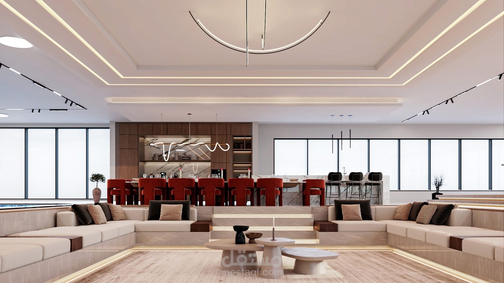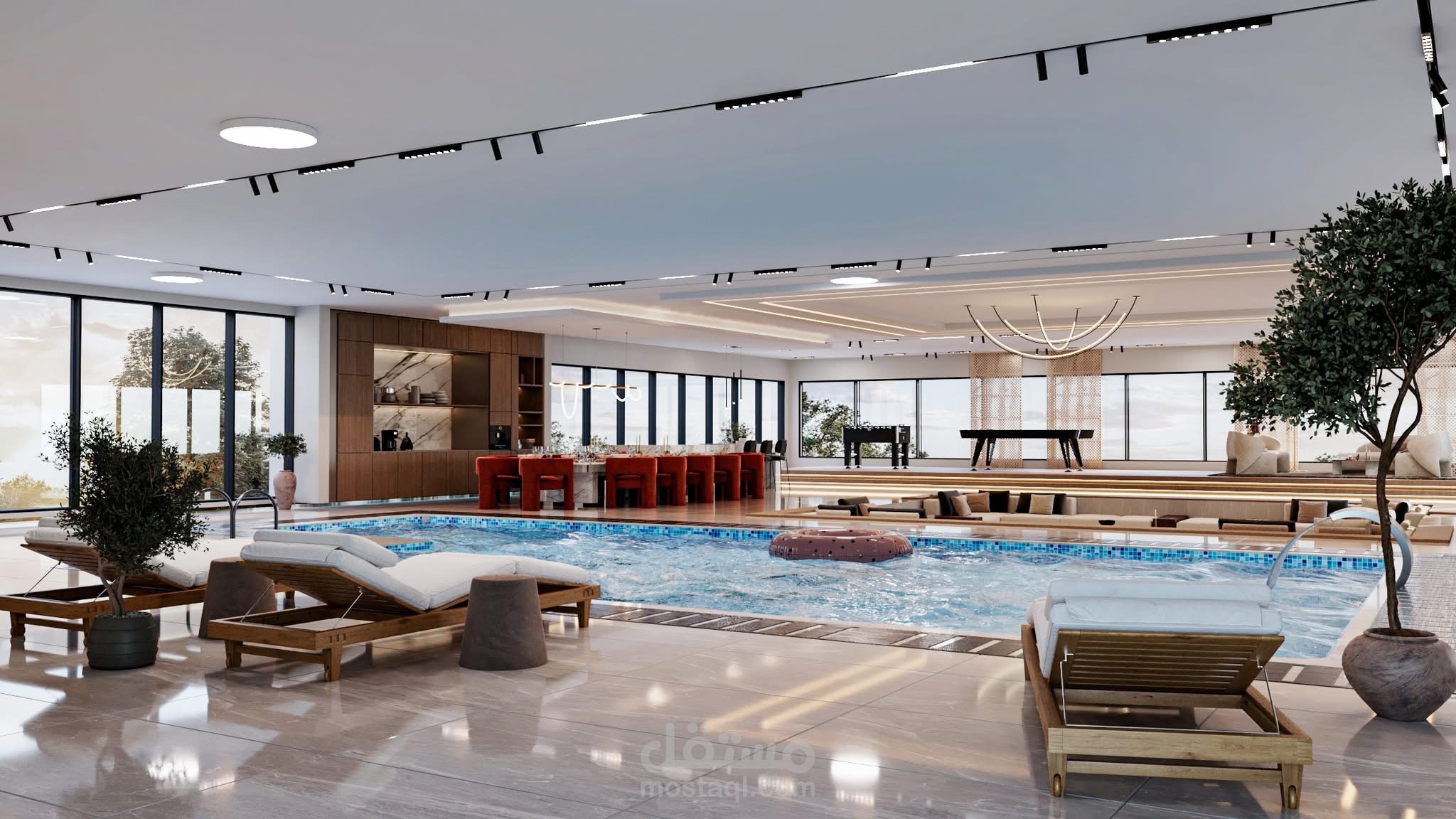 نادي ترفيهي يشمل جلسه شبابيه ومسبح وطاوله طعام ومطبخ