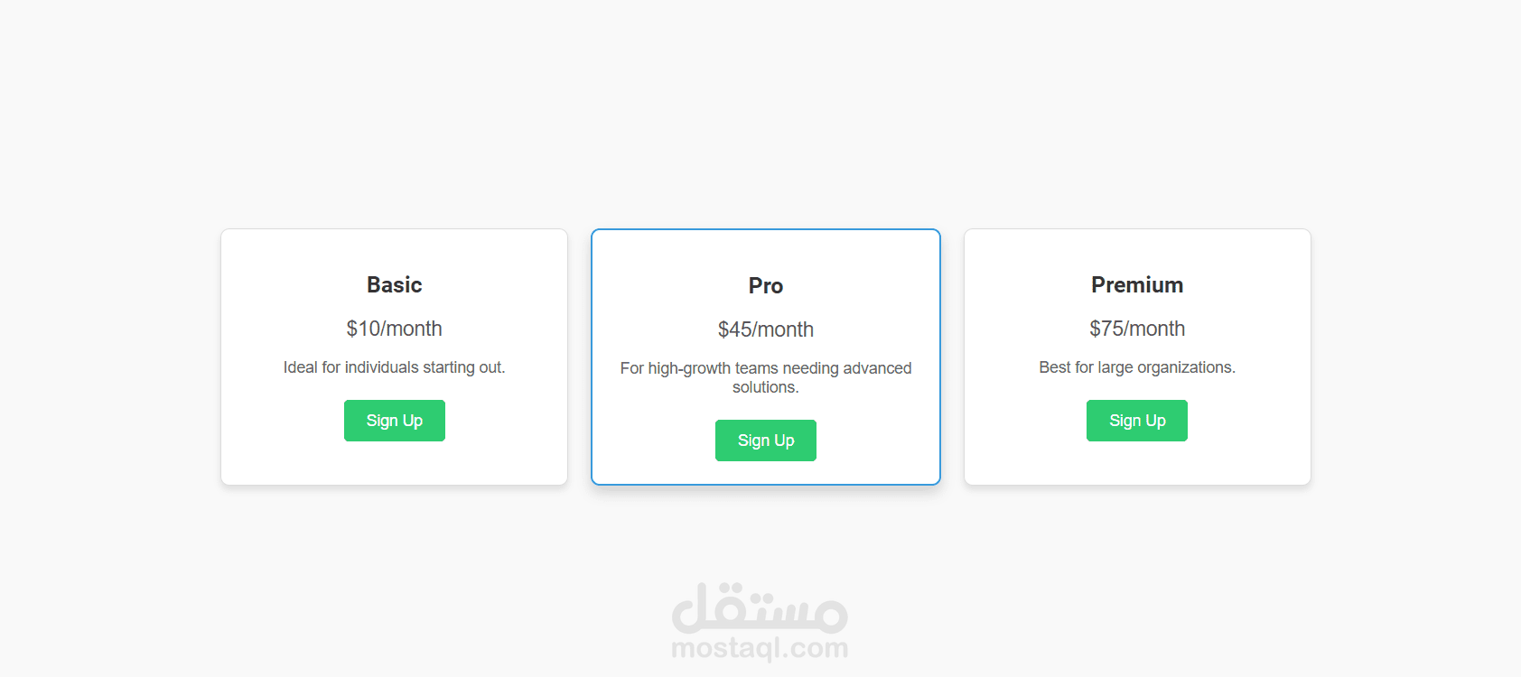 كان مطلوب تصميم واجهة تسعير تقدم ثلاث خطط اشتراك: Basic، Pro، وPremium، بحيث: