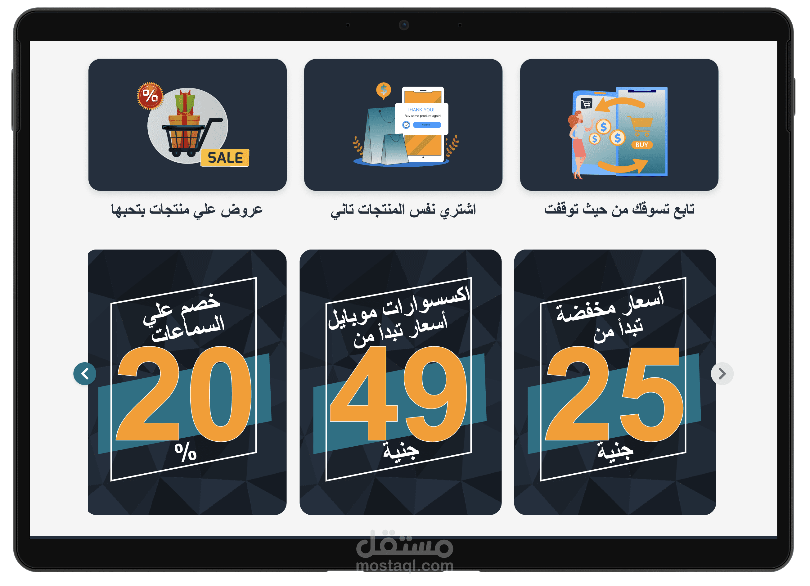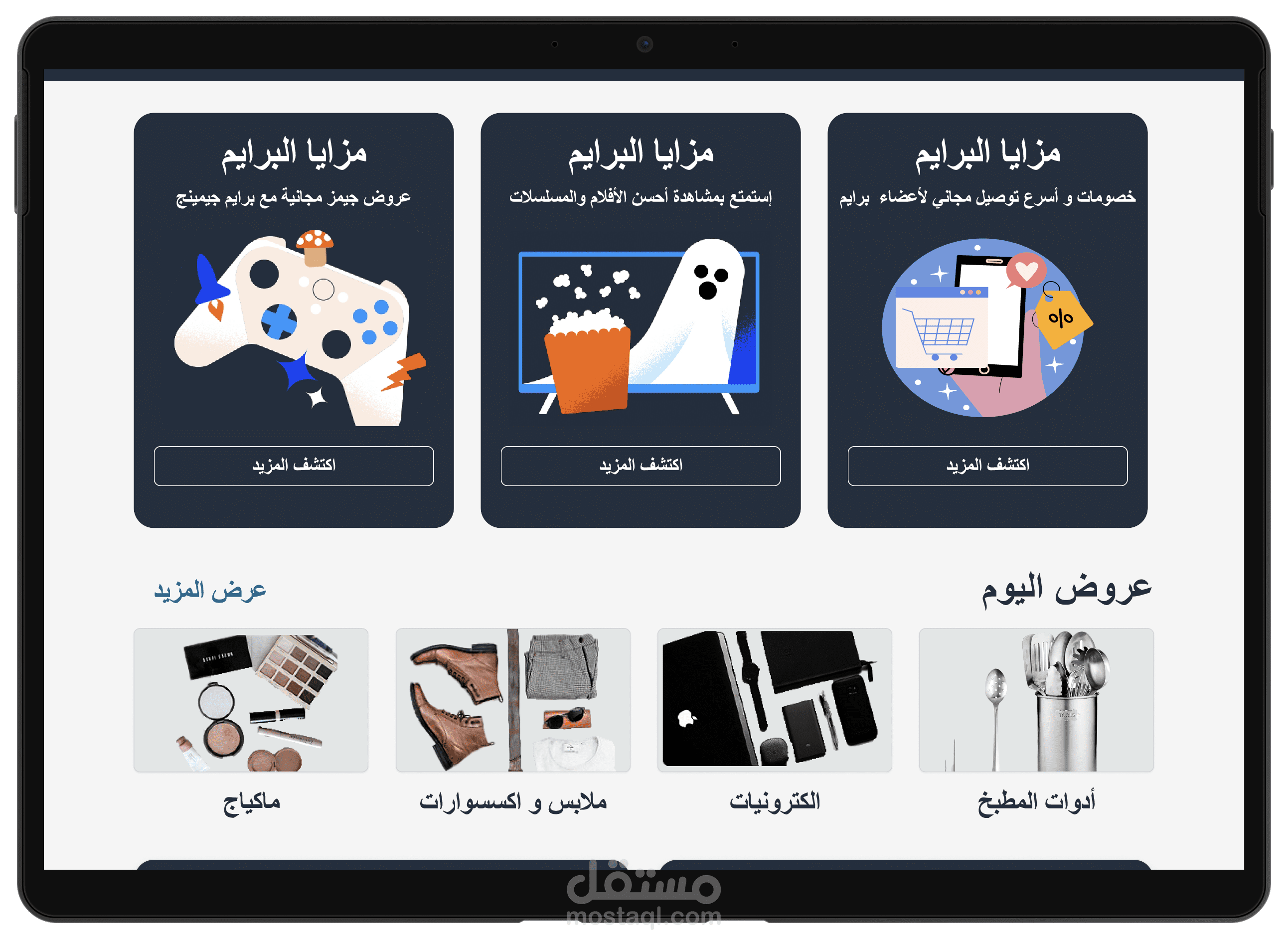 * **بانر رئيسي ديناميكي:** عرض بانر رئيسي متجدد يعرض العروض الترويجية والمنتجات الأكثر شعبية، مع صور عالية الجودة ونصوص موجزة.