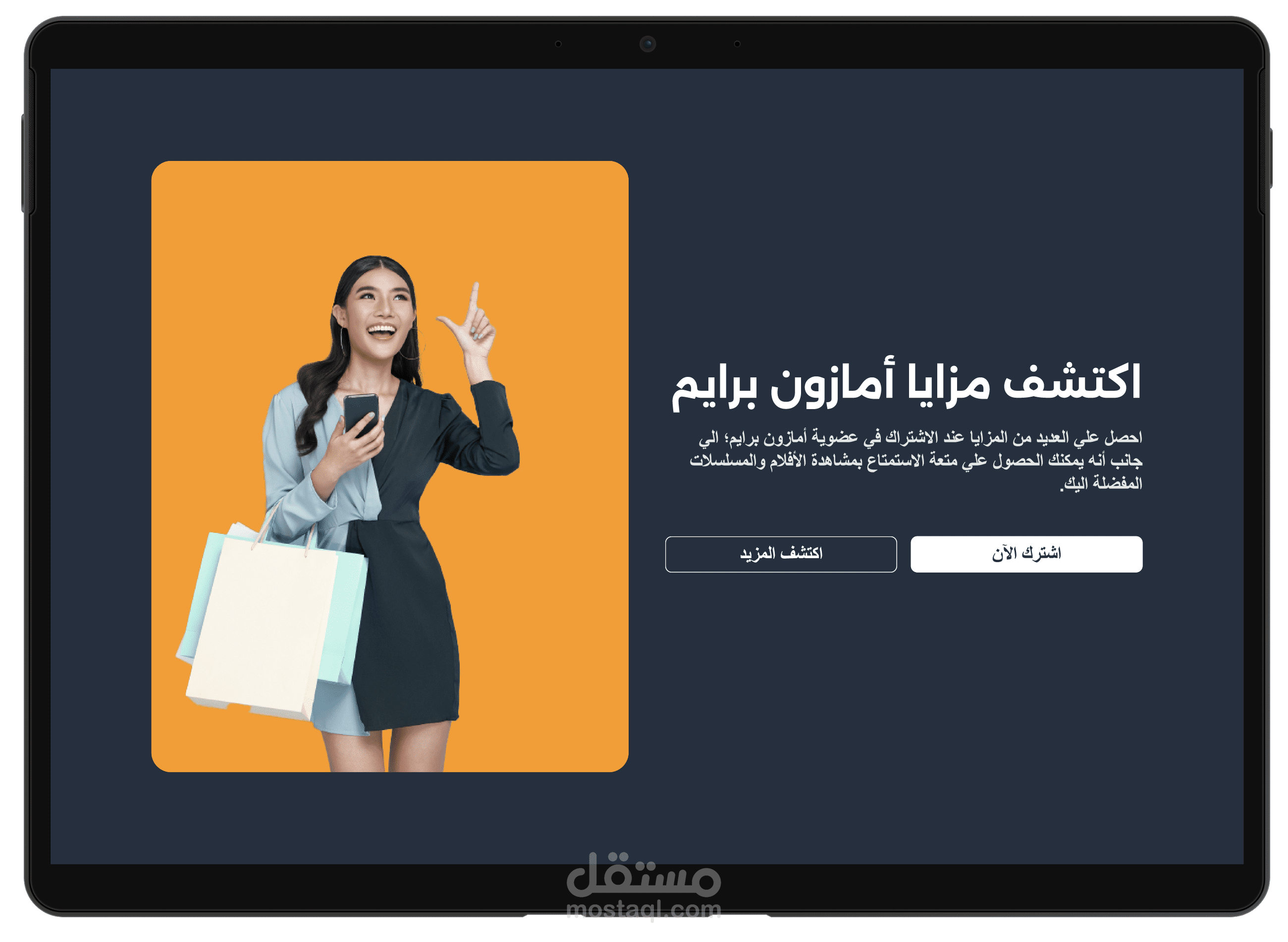 بالتأكيد، إليك وصفًا متوسطًا باللغة العربية لتصميم جديد لصفحة أمازون الرئيسية: