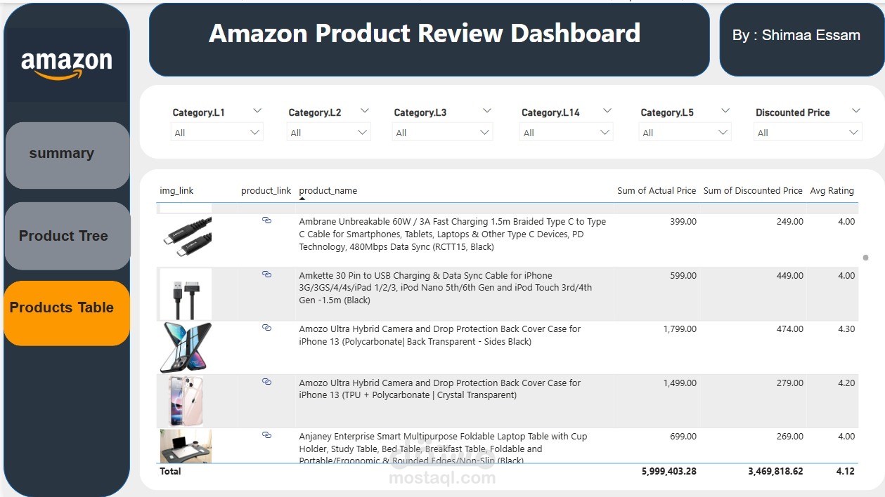 لوحة تحكم تفاعلية تم تصميمها باستخدام Power BI لتحليل تقييمات منتجات أمازون، مما يتيح للمستخدمين استكشاف العلاقة بين الخصومات ومتوسط التقييمات بسهولة. توفر اللوحة تجربة مستخدم سلسة من خلال نظام تنقل منظم وفلاتر ديناميكية تتيح تصفية البيانات وفقًا للتصنيفات المختلفة.