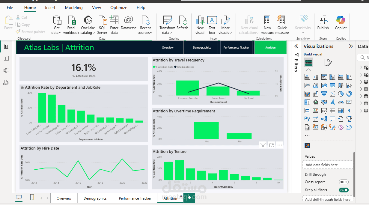 هذه الـ Dashboards توفر رؤية شاملة عن بيانات الموظفين في Atlas Labs، بما يشمل التوظيف، الاستنزاف، الأداء، والرضا الوظيفي،