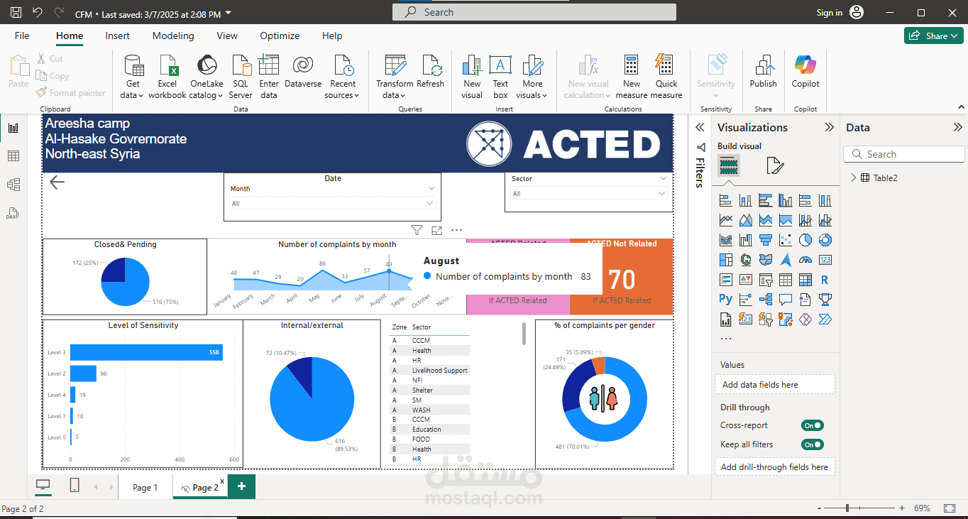 قمت بتصميم لوحة تفاعلية باستخدام POWERBI لقسم الشكاوي في مخيم العريشة شمال شرق سوريا الخاضع للإدارة منظمة اكتد