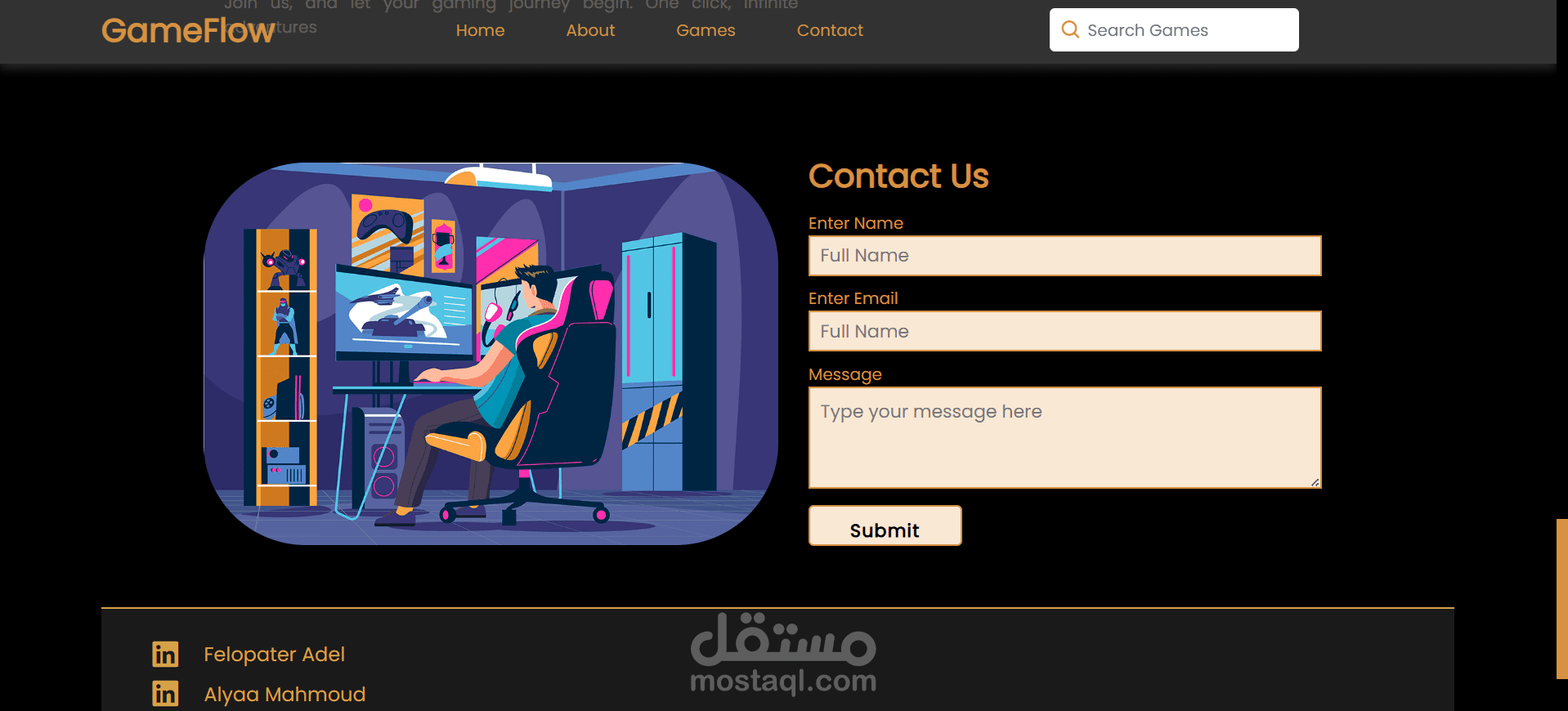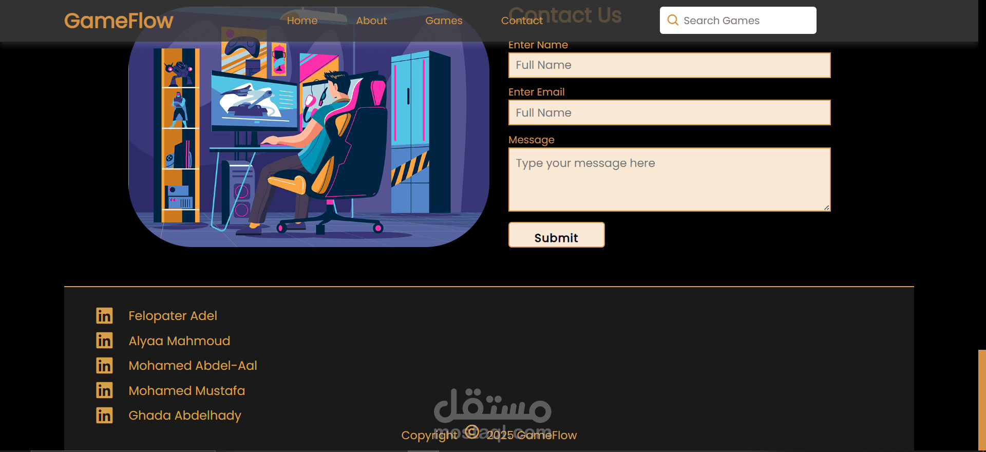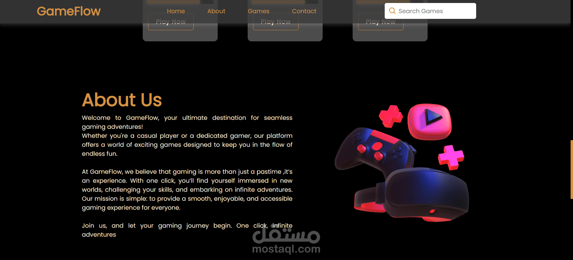 مشروع Game Flow هو موقع ويب تفاعلي مصمم ليكون معرضًا رقميًا للألعاب، حيث يعرض مجموعة من الألعاب بطريقة جذابة وسلسة. الموقع يتميز بتصميم أنيق وتجربة مستخدم مميزة وهو عباره عن Landing Page يحتوي على عدة أقسام رئيسية: