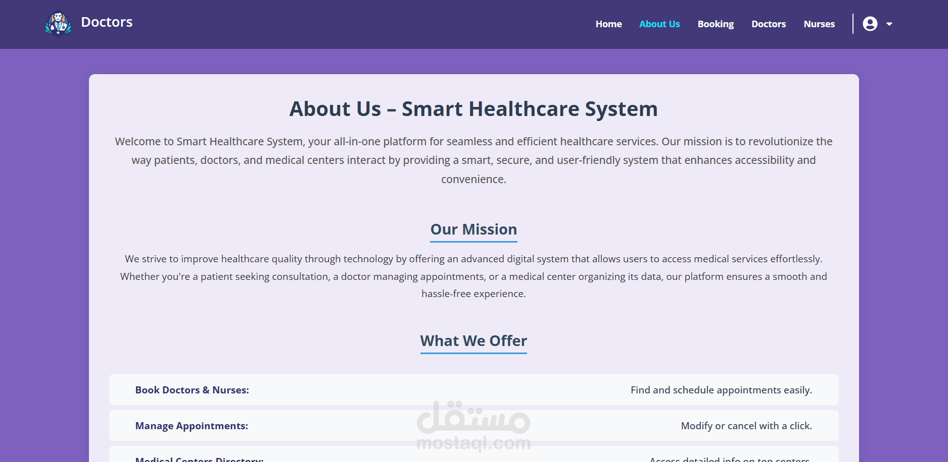 يشمل النظام إدارة المستخدمين، الأطباء، الممرضين، المراكز الطبية، الأقسام، الأمراض، الحجوزات، بالإضافة إلى مكتبة فيديوهات للتوعية الصحية.