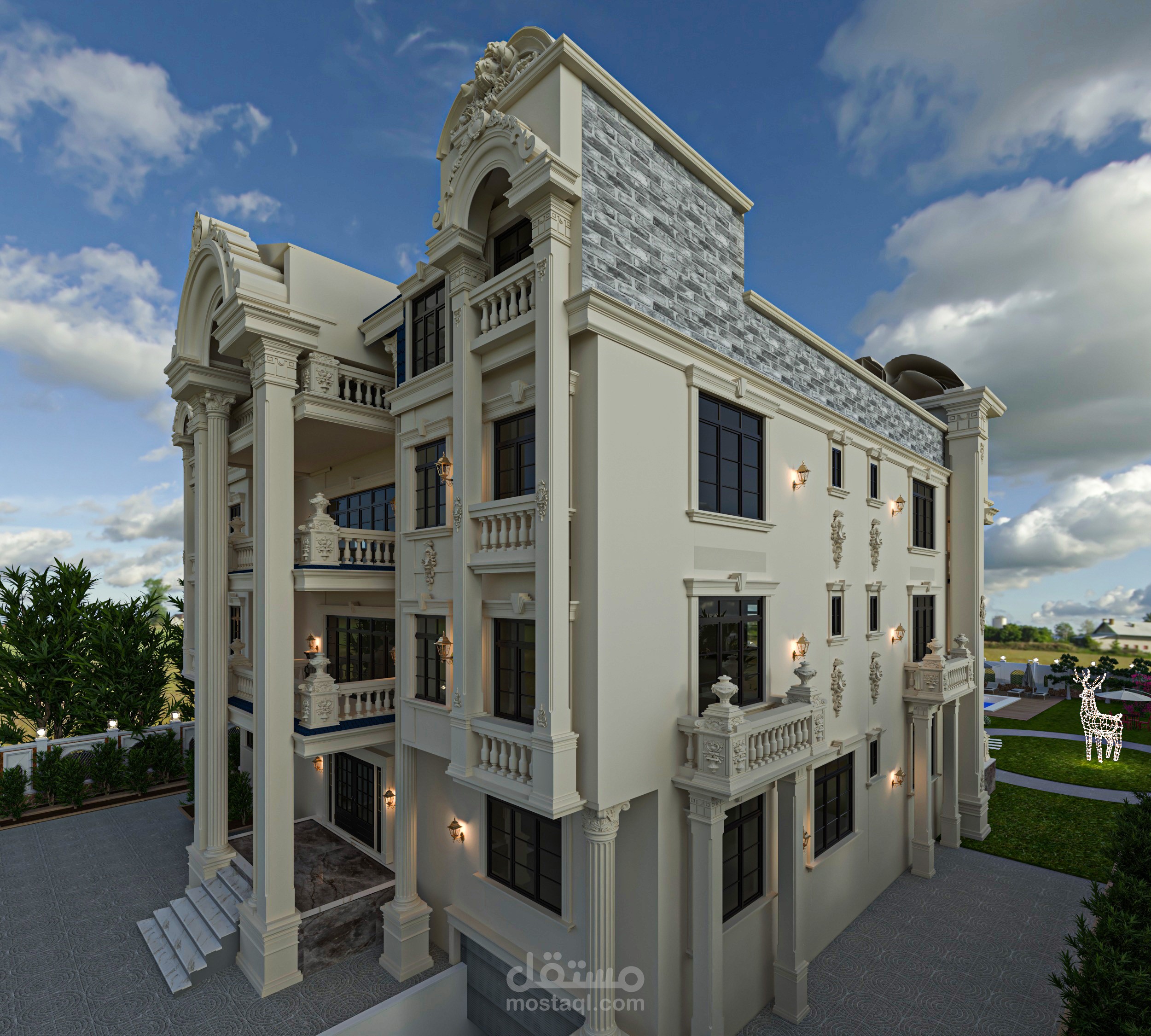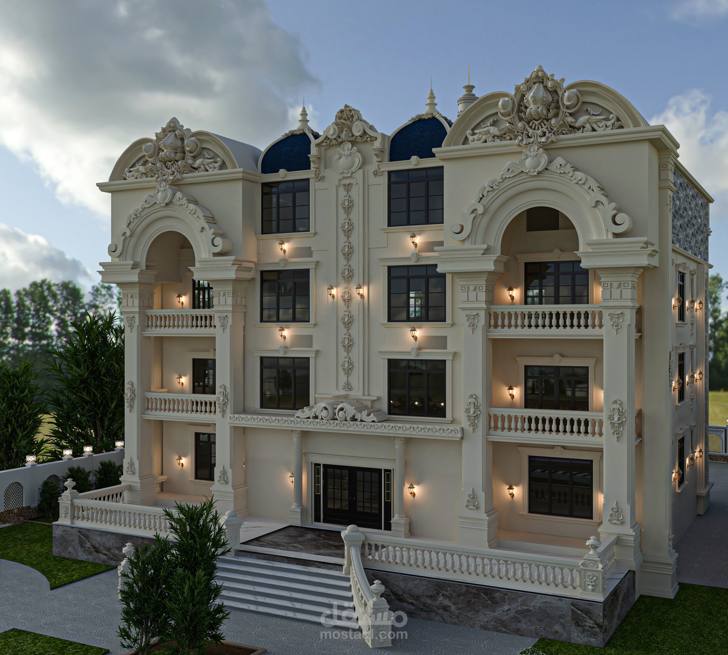 تم تصميم المخططات المعمارية بناءا على تحقيق رغبات العميل باستخدام برنامج Autocad وصولا الى تصميم الواجهات باستخدام برنامج 3dmax