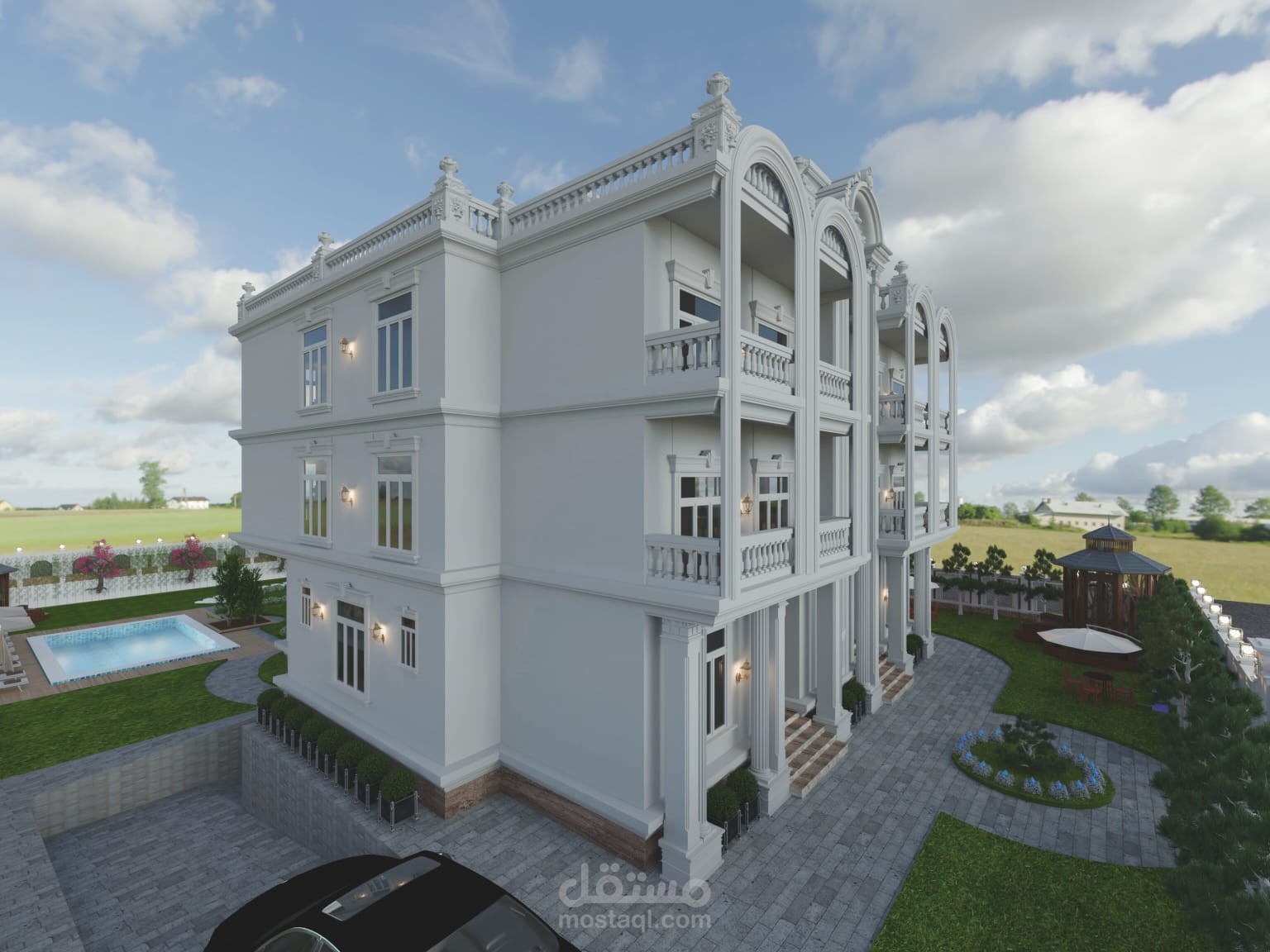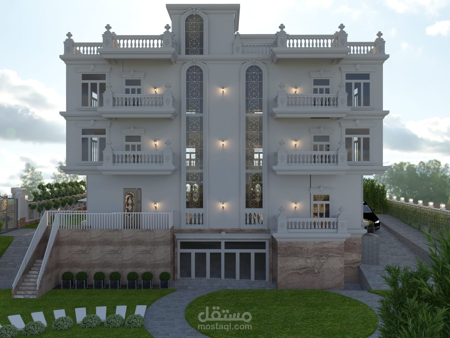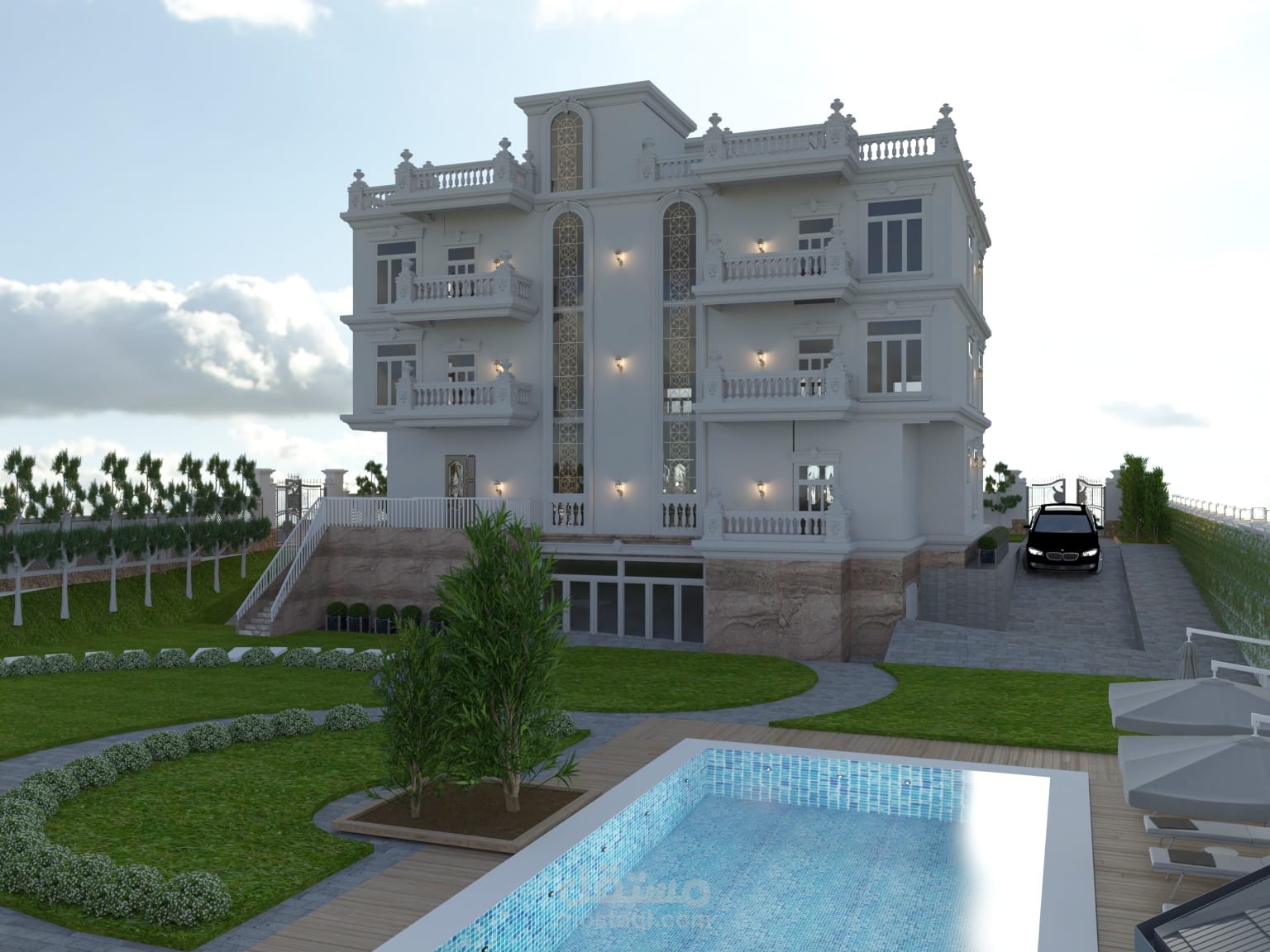 تم تصميم المخططات المعمارية بناءا على رغبة العميل باستخدام برنامج Autocad ثم القيام بعمل تصميم ثلاثى الابعاد لاظهار الواجهات المعمارية للمبنى باستخدام برنامج3dmax
