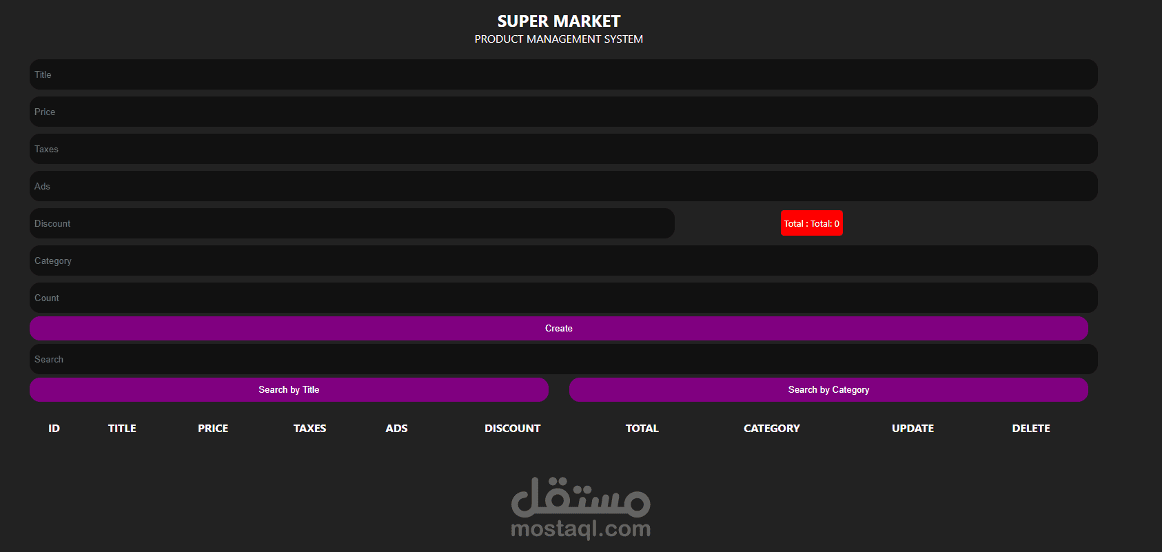 قمت بتطوير نظام CRUDs كامل باستخدام HTML و CSS و JavaScript فقط، دون الاعتماد على مكتبات أو أطر عمل خارجية. يهدف المشروع إلى توفير واجهة استخدام ديناميكية تسمح بإدارة البيانات بشكل بسيط وسريع.