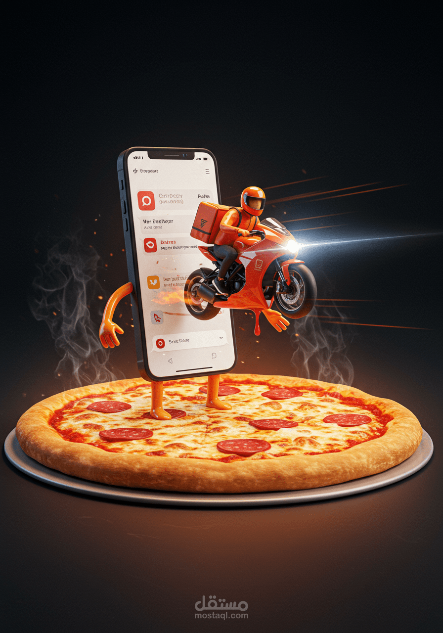 إعلان إبداعي لخدمة توصيل البيتزا، يجمع بين التكنولوجيا والسرعة في التصميم لإبراز سهولة الطلب وسرعة التوصيل.