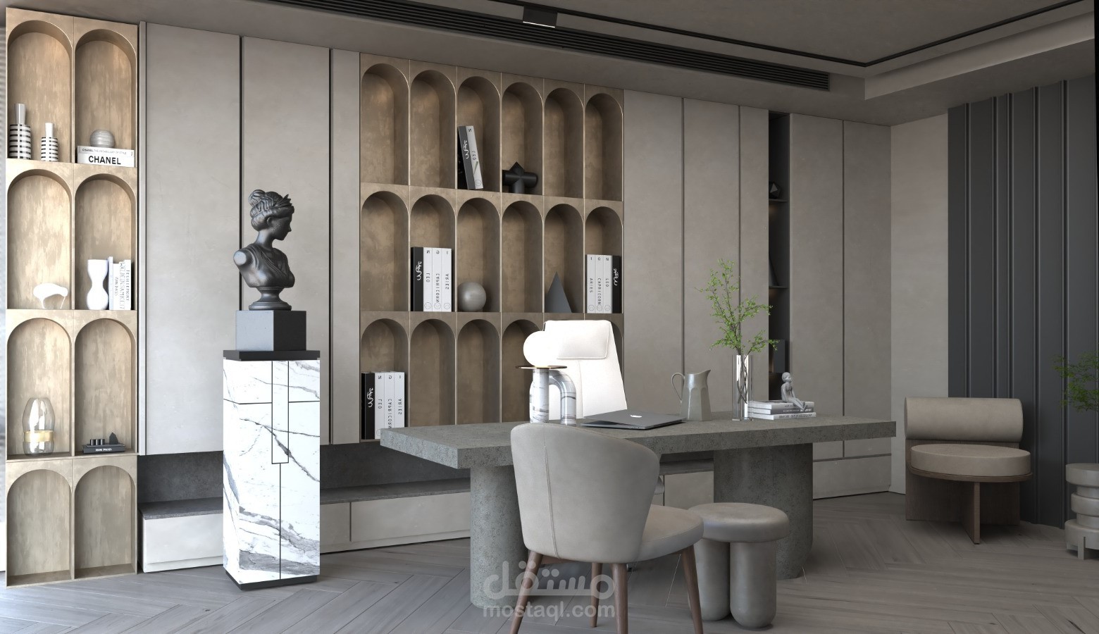 تصميم مكتبي يجسد الفخامة العصرية بلمسة تقنية راقية، حيث تمتزج الألوان الحيادية مع الخامات الفاخرة لتقديم بيئة عمل راقية ومريحة. يبرز الجدار الخلفي بوحدات تخزين مفتوحة ذات أقواس أنيقة، تعزز الإحساس بالتناغم والتوازن في الفراغ. ويكتمل المشهد بمقاعد جلدية بتصميم منحني يحقق الراحة والبساطة في آنٍ واحد. استخدام الإضاءة غير المباشرة واللمسات الديكورية مثل التماثيل والنباتات الطبيعية يضفي حيوية ودفئًا على المكان، مما يجعله مثاليًا لمكتب يجمع بين الأناقة والوظيفية بأسلوب متطور.