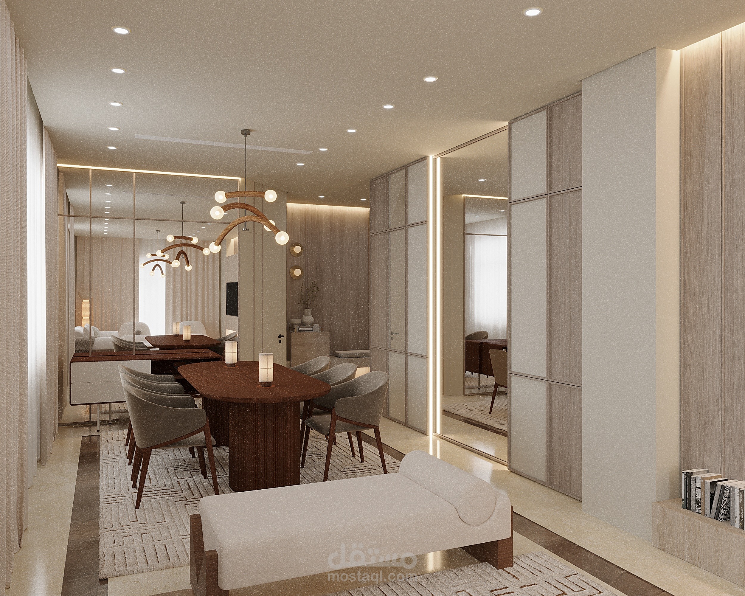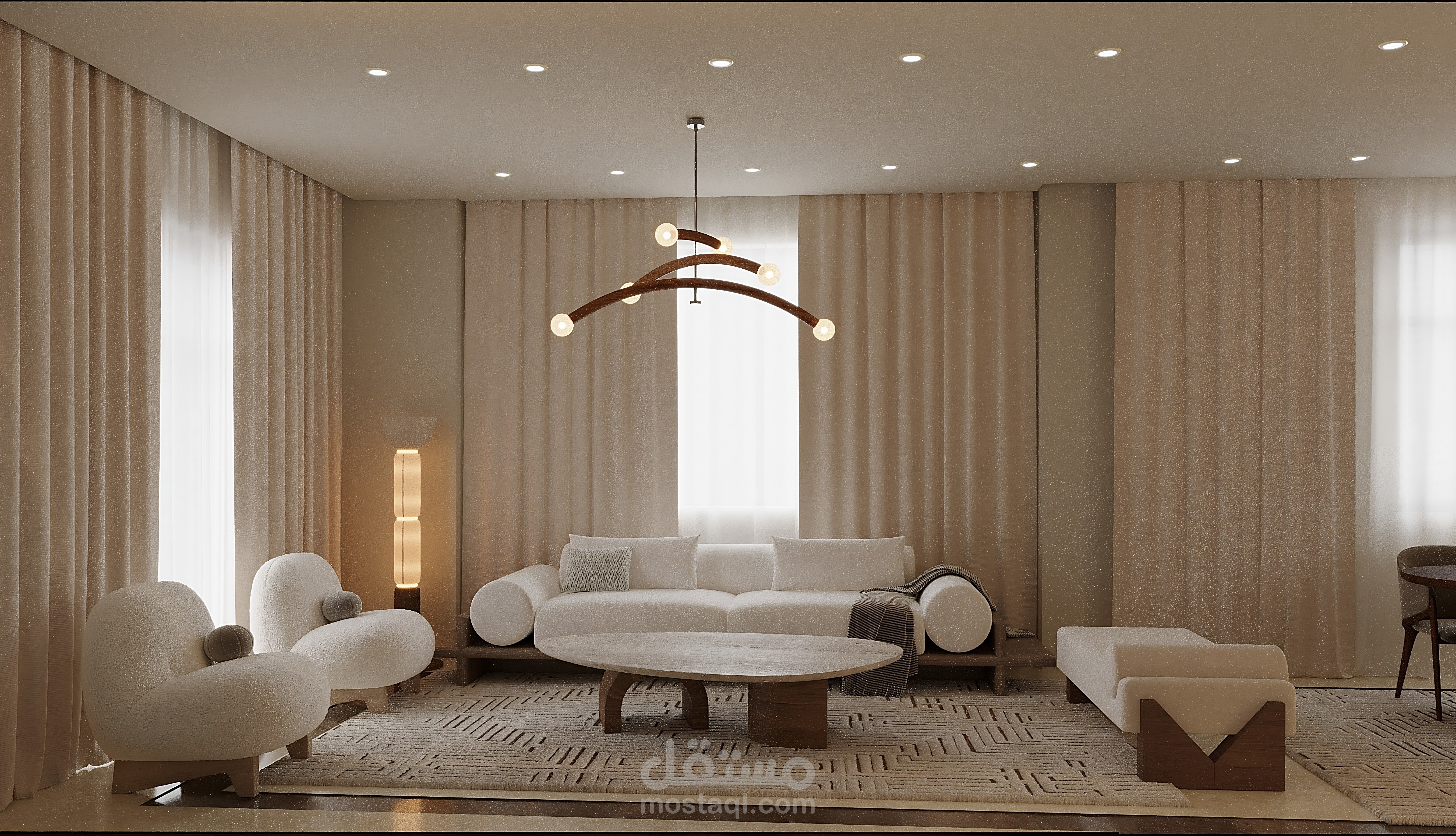 "A modern living room design with organic touches highlighting natural beauty and simplicity. A neutral color palette and wooden details create a warm and cozy atmosphere. The curved furniture and distinctive lighting enhance the organic feel, making the space perfect for family gatherings or relaxation. The design balances functionality and elegance, reflecting a contemporary and comfortable lifestyle.
