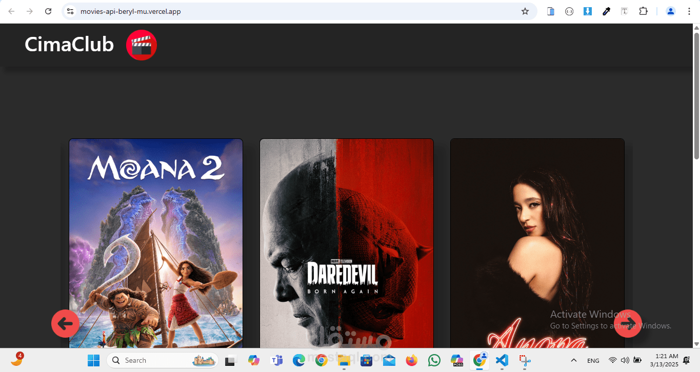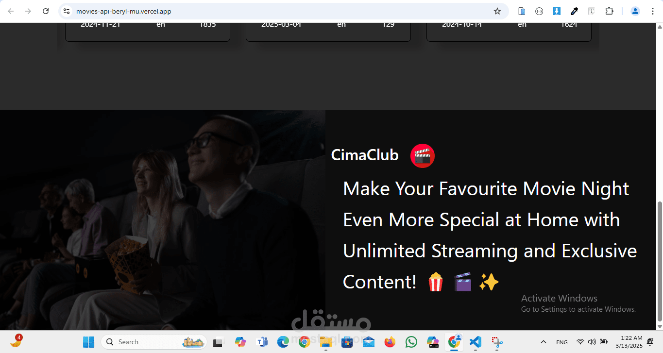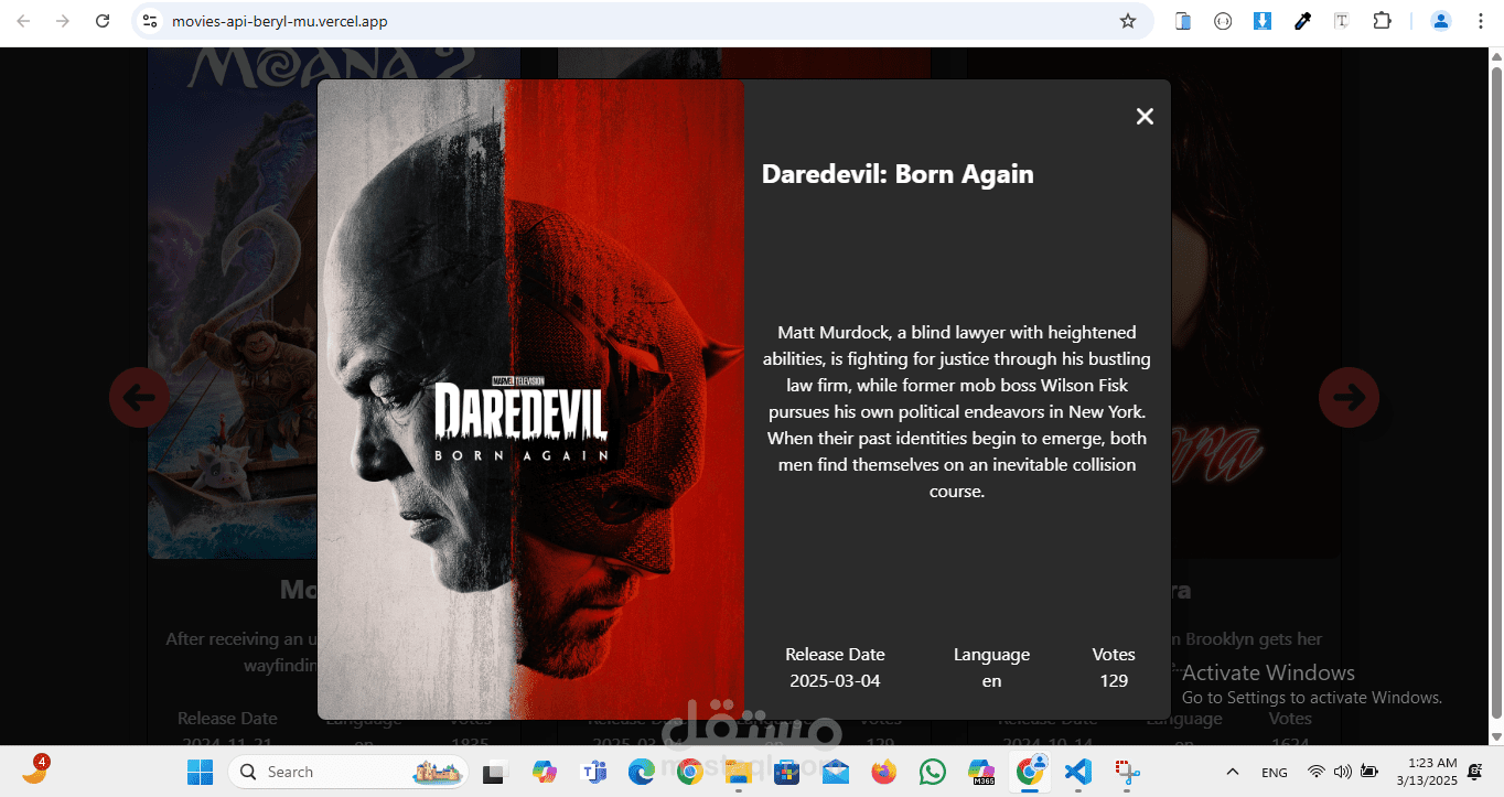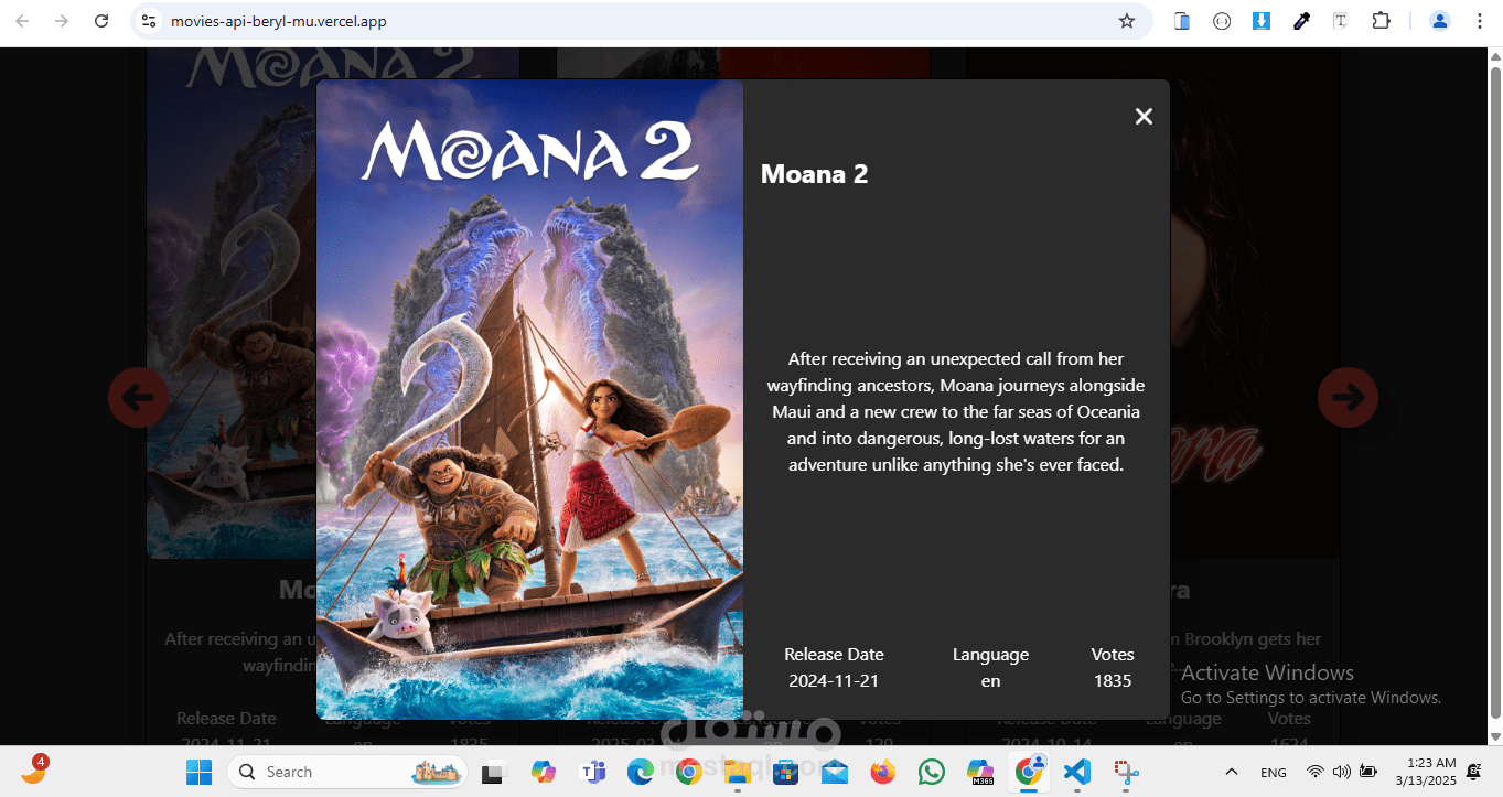 2.عند النقر على فيلم معين، تظهر نافذة منبثقة (Modal) تحتوي على معلومات تفصيلية عن الفيلم، مثل: