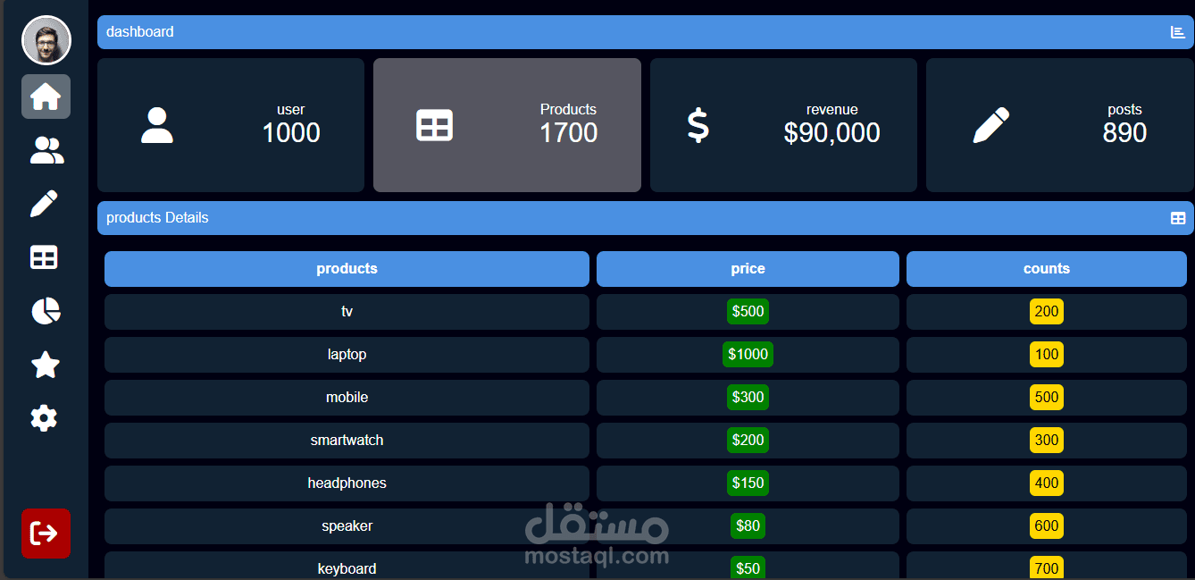 لوحة تحكم يمكن من خلالها عرض بيانات عن users,products,revenue,posts .