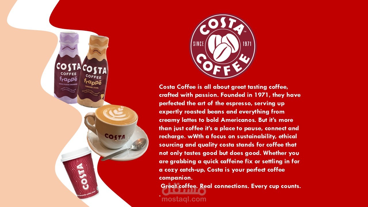 I created an animated PowerPoint for Costa Coffee with smooth transitions. The slides showcased the brand and key messages. The design ensured a polished and engaging presentation.
