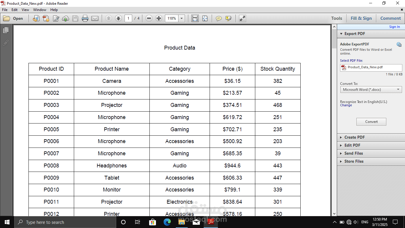 تم حساب إجمالي الكمية المتاحة لكل منتج، وتم تحديد المنتج ذو أعلى كمية في المخزون (الميكروفون بـ 3184 وحدة) والمنتج ذو أقل كمية (الباور بانك بـ 394 وحدة). إجمالي الكمية في المخزون لجميع المنتجات بلغ 26819 وحدة.