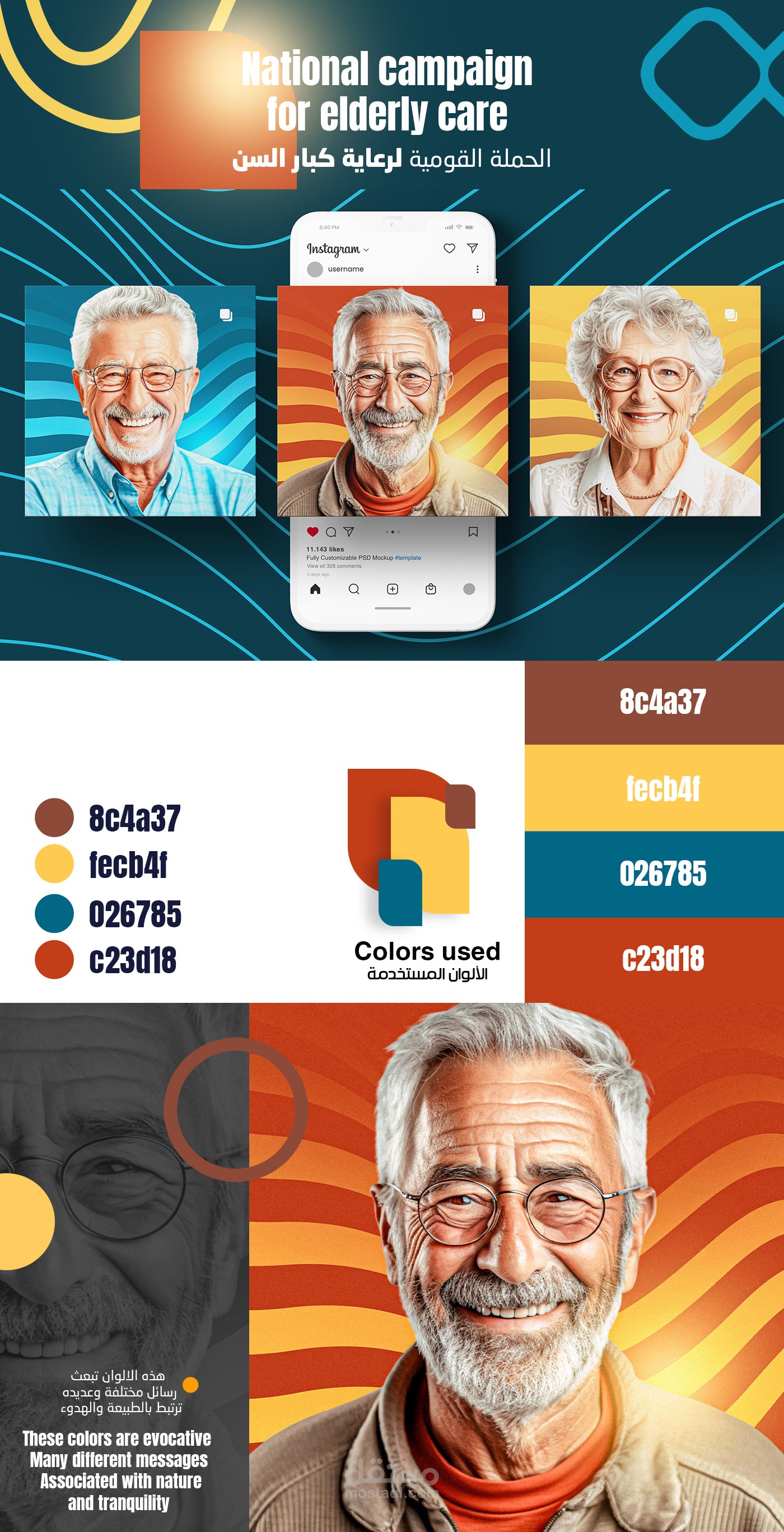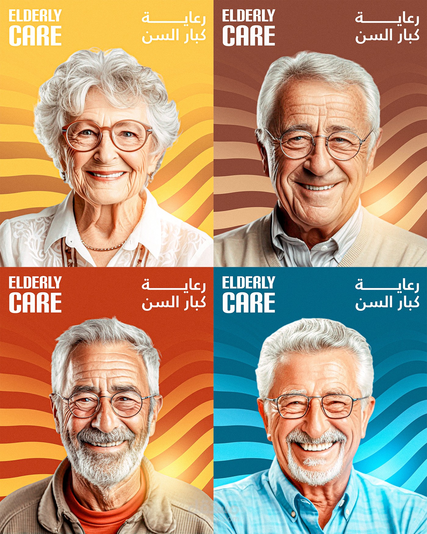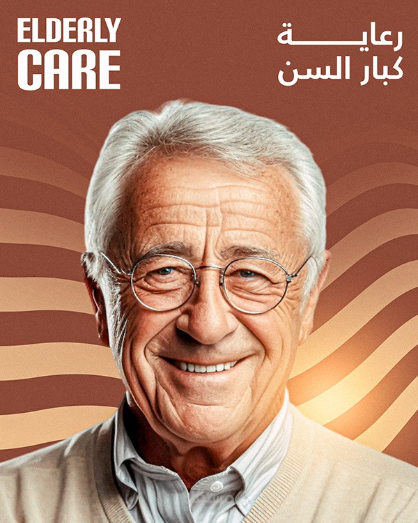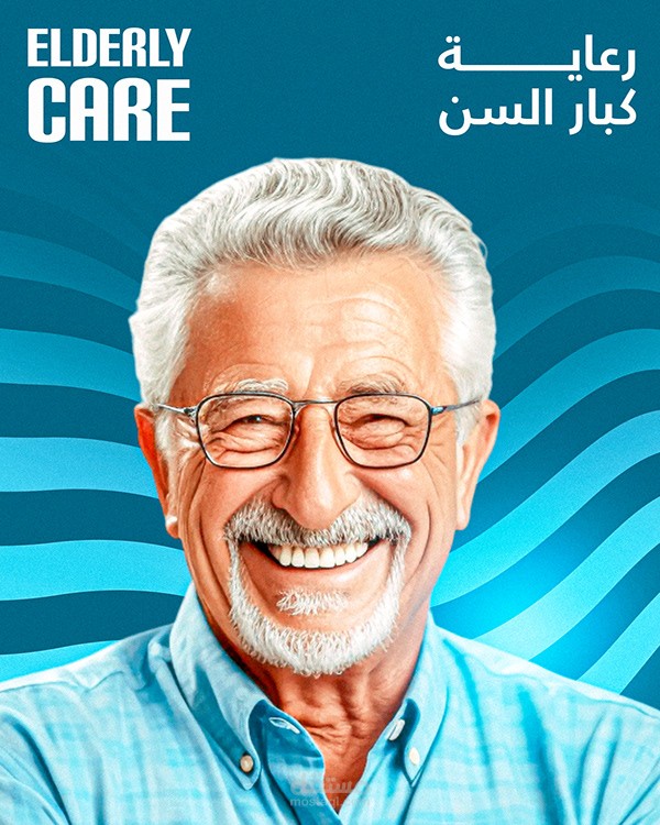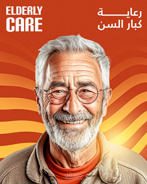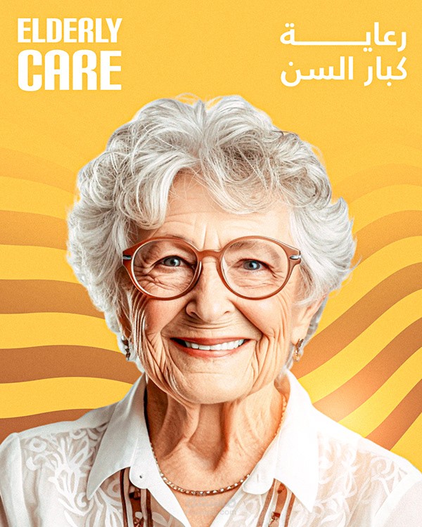 التركيز على العنصر الإنساني (صور المسنين) في المنتصف، مع توزيع ذكي للألوان والعناصر الرسومية حوالين الصور.