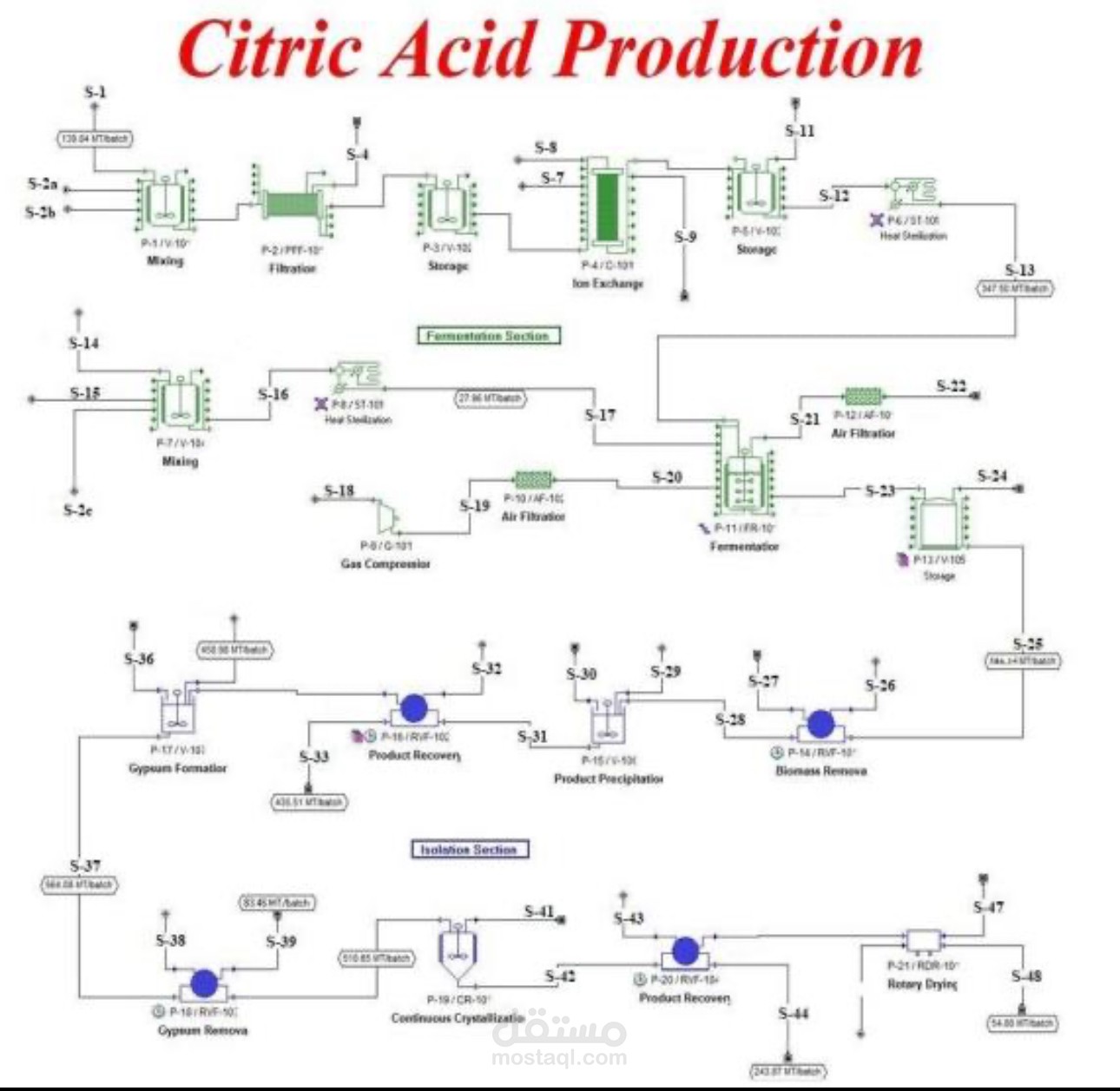 In this project, Citric acid was produced using submerged fermentation of Aspergillus Niger GCMC-7 which consume sugarcane molasses, ammonium sulfate, and dipotassium phosphate as nutrient sources. The process included fermentation section (where Citric acid produced) and Isolation section (where Citric acid harvested) with a 99% purity.