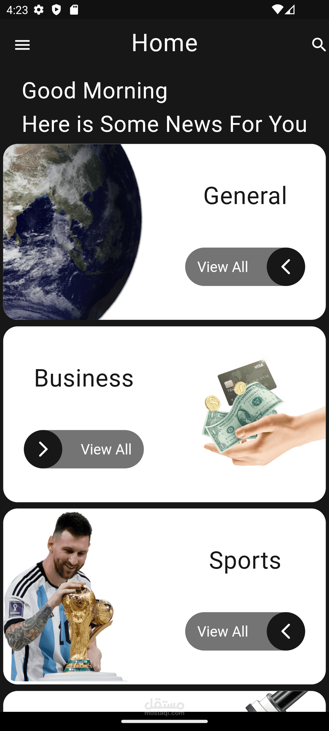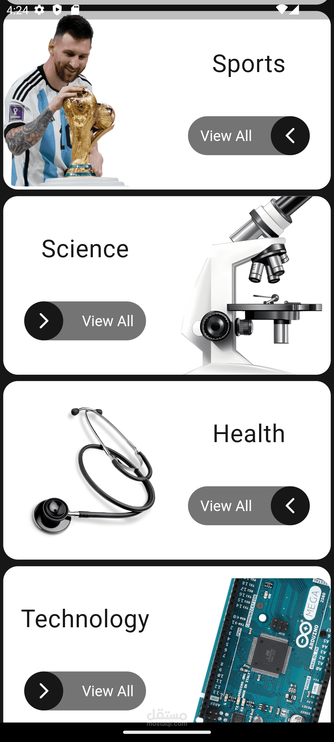 تطبيق لعرض الاخبار تم به استخدام ال APIs لجلب الاخبار وعرض تصميم واجهة جيد ويتم به عرض اخبار عامة واقتصادية ورياضية وصحة وترفيه وعلوم وتكنلوجيا وعند الضغط على احدى المجالات يظهر اكتر من مصدر للأخبار عن هنا المجال وعند الضغط على اي خبر منهم يظهر ملخص عن الخبر في bottom sheet ومع زرار view article عند الضغط عليه يظهر الخبر كاملا من مصدره