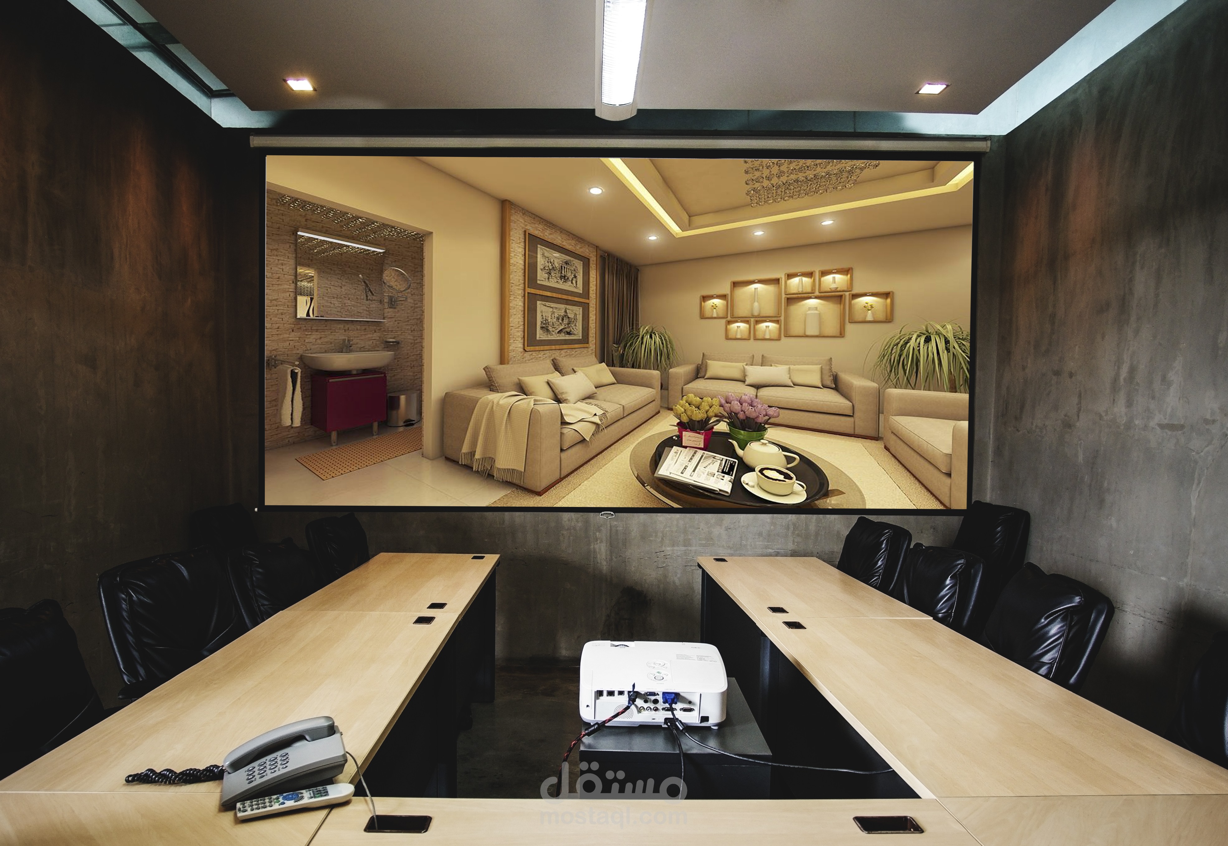 تصميم داخلي يمثل غرفة معيشة بطريقة معاصرة وإختيار الألوان المناسبة لها .