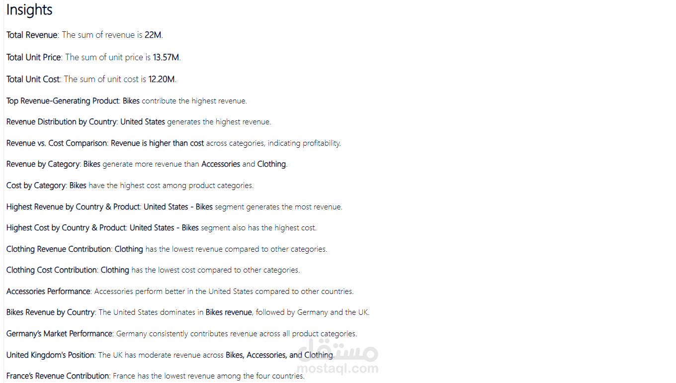 This project is an analytical dashboard that visualizes revenue and cost data across different countries and product categories. It provides a clear overview of product performance in various markets, enabling data-driven decision-making.