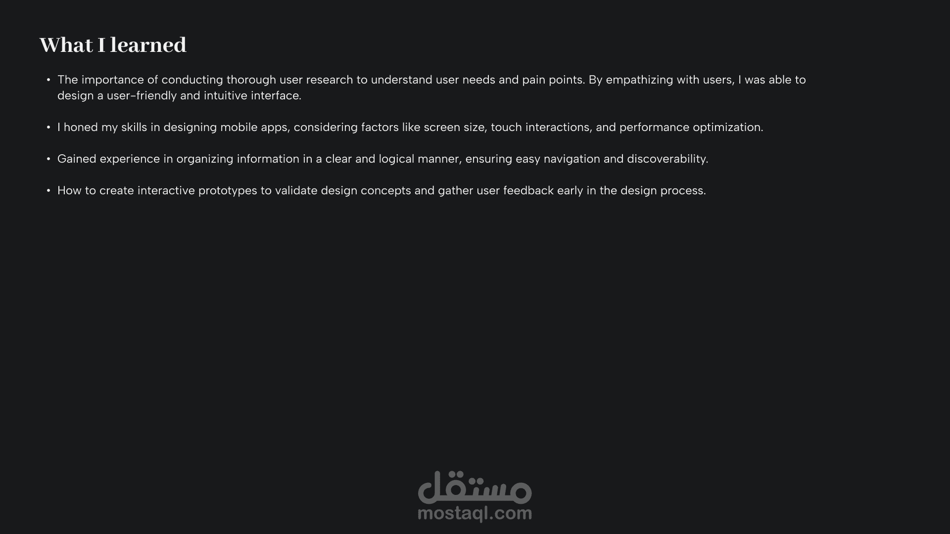 لتحقيق ذلك، قمت بإجراء بحث مستخدم، ووضع هيكل معلومات واضح وتدفق سلس للمستخدم، وإنشاء إطارات سلكية ونماذج أولية، وتصميم واجهة مستخدم سهلة الاستخدام، وتحديد الهوية البصرية للتطبيق. بالإضافة إلى ذلك، أنشأت نماذج تفاعلية لعرض وظائف التطبيق وجمع ملاحظات المستخدمين.