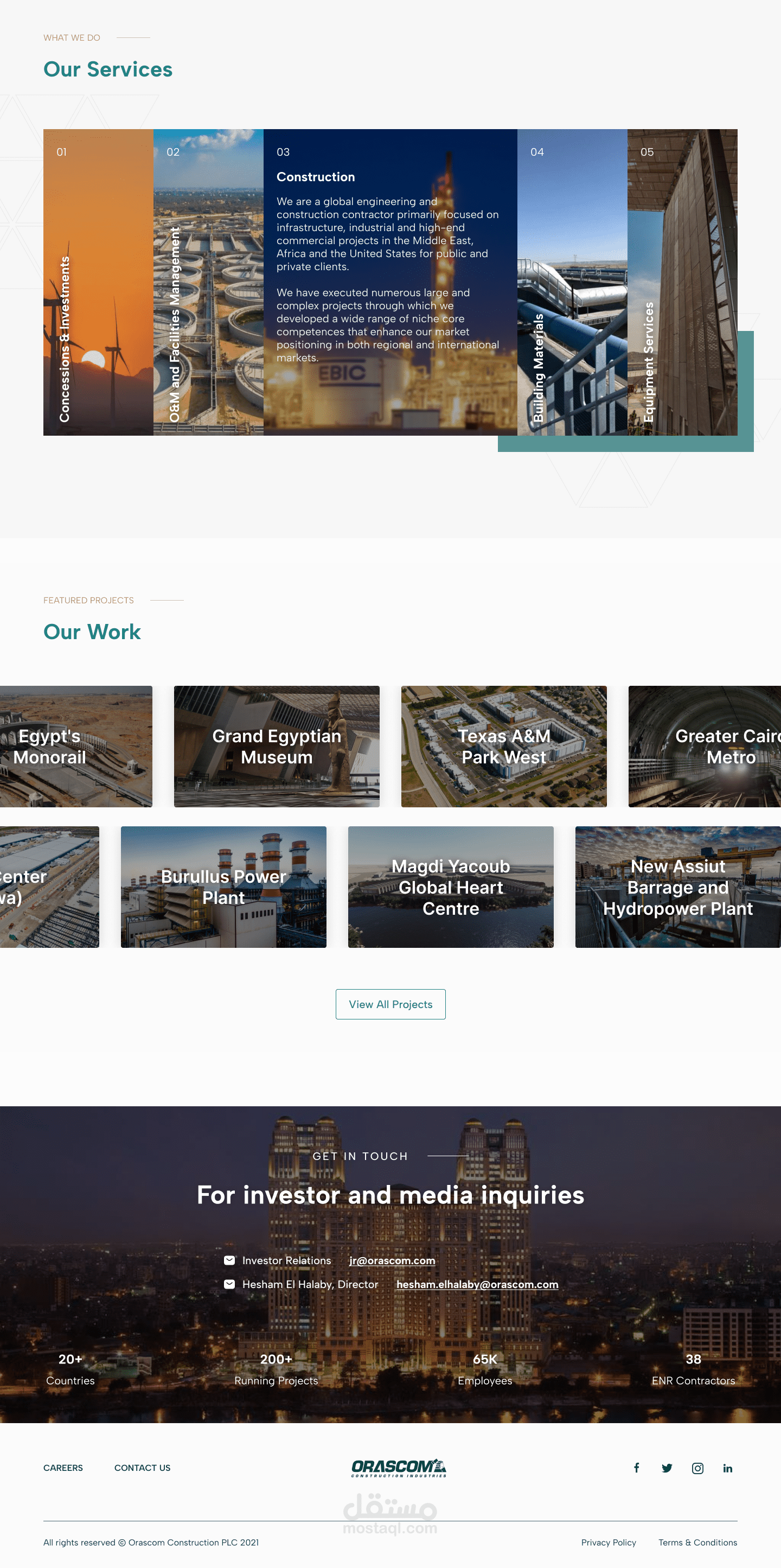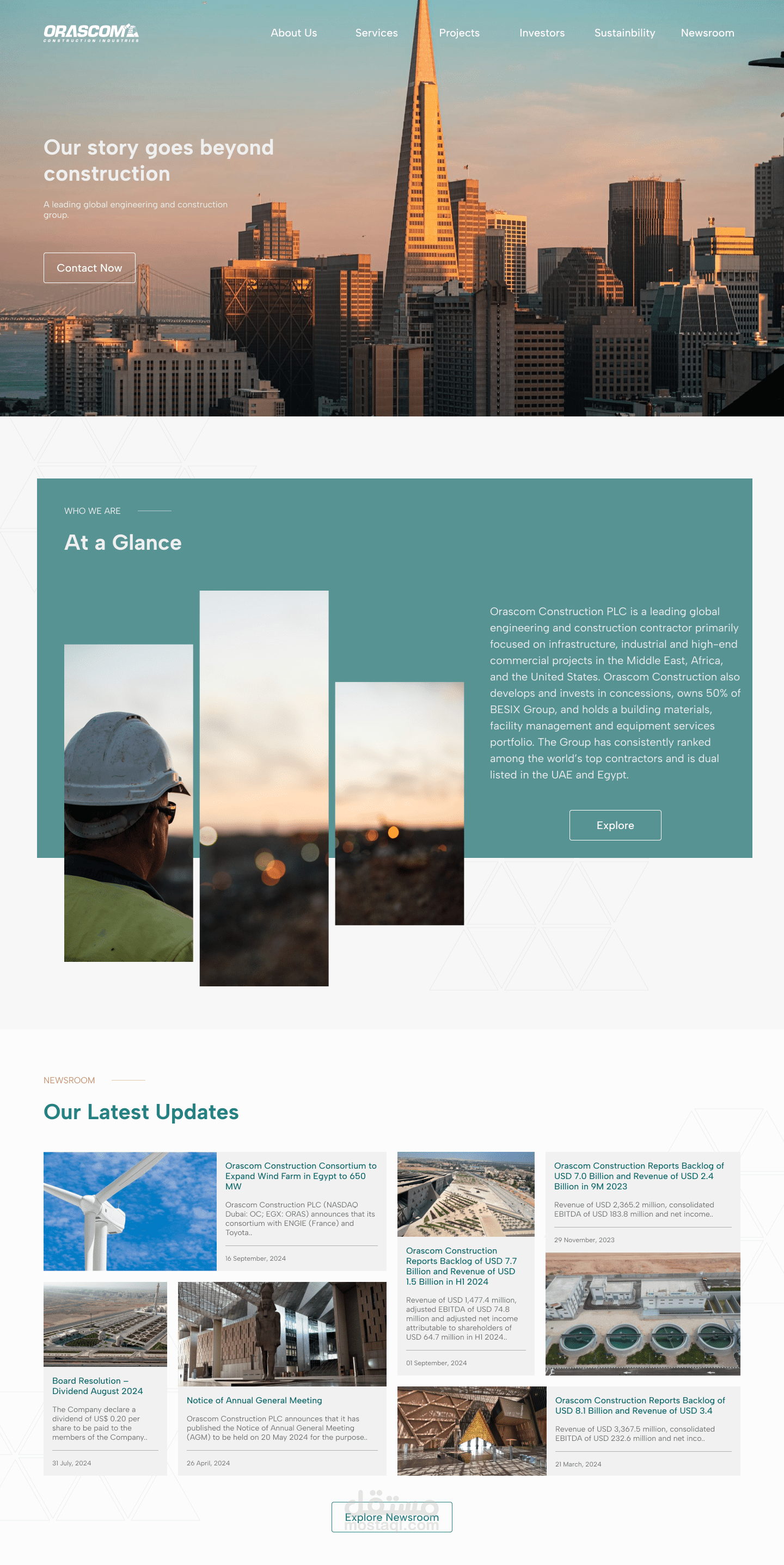 مفهوم تصميم جديد للصفحة الرئيسية لشركة أوراسكوم للإنشاءات، حيث كان الهدف هو تحديث مظهر الواجهة وإعادة بناء الهوية البصرية للعلامة التجارية.