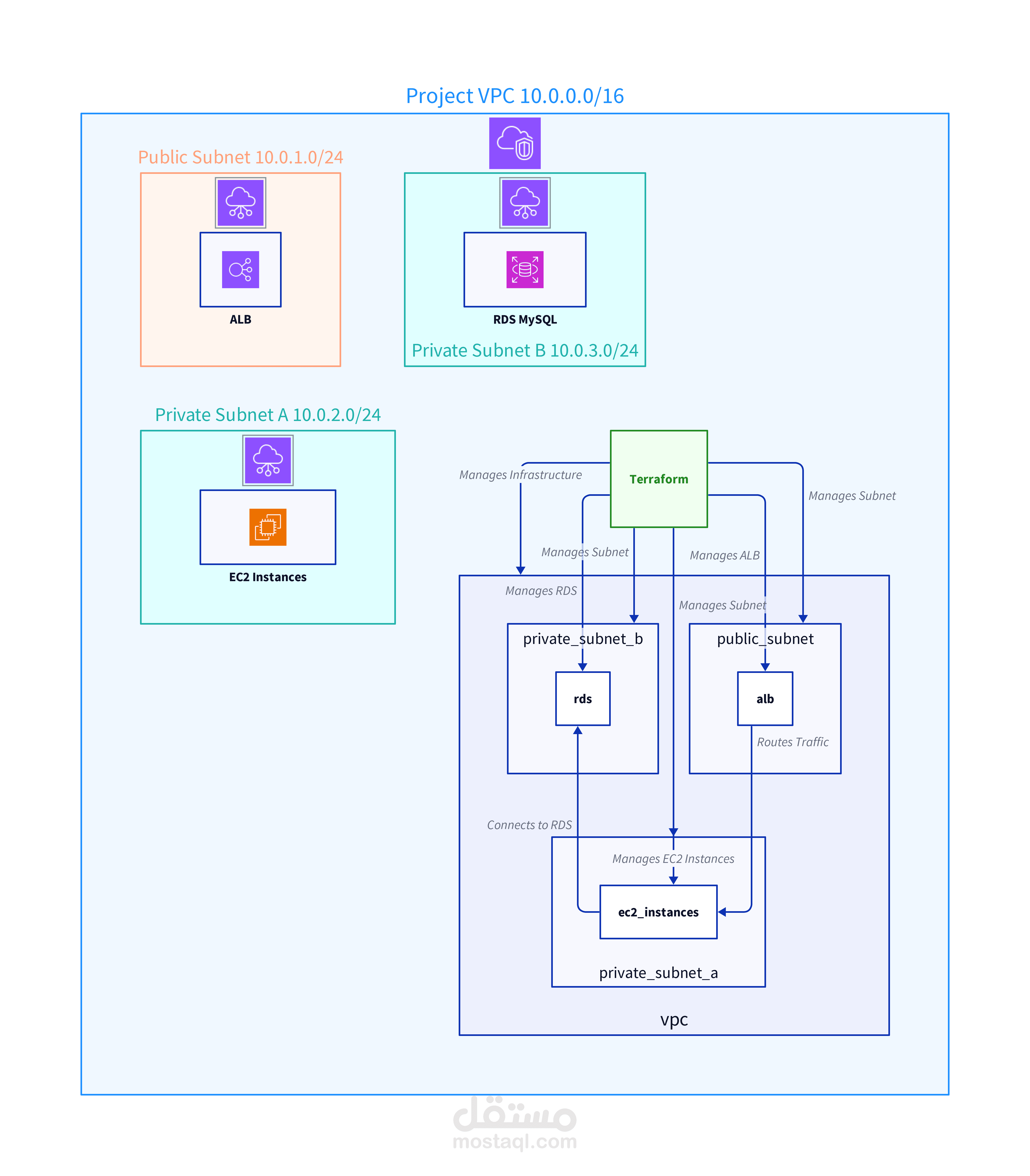 This project demonstrates how to deploy secure EC2 instances connected to a shared RDS database on AWS using Terraform. We'll walk through setting up a Virtual Private Cloud (VPC), Elastic Compute Cloud (EC2) instances, and a Relational Database Service (RDS) instance, while adhering to best practices for security, scalability, and maintainability.