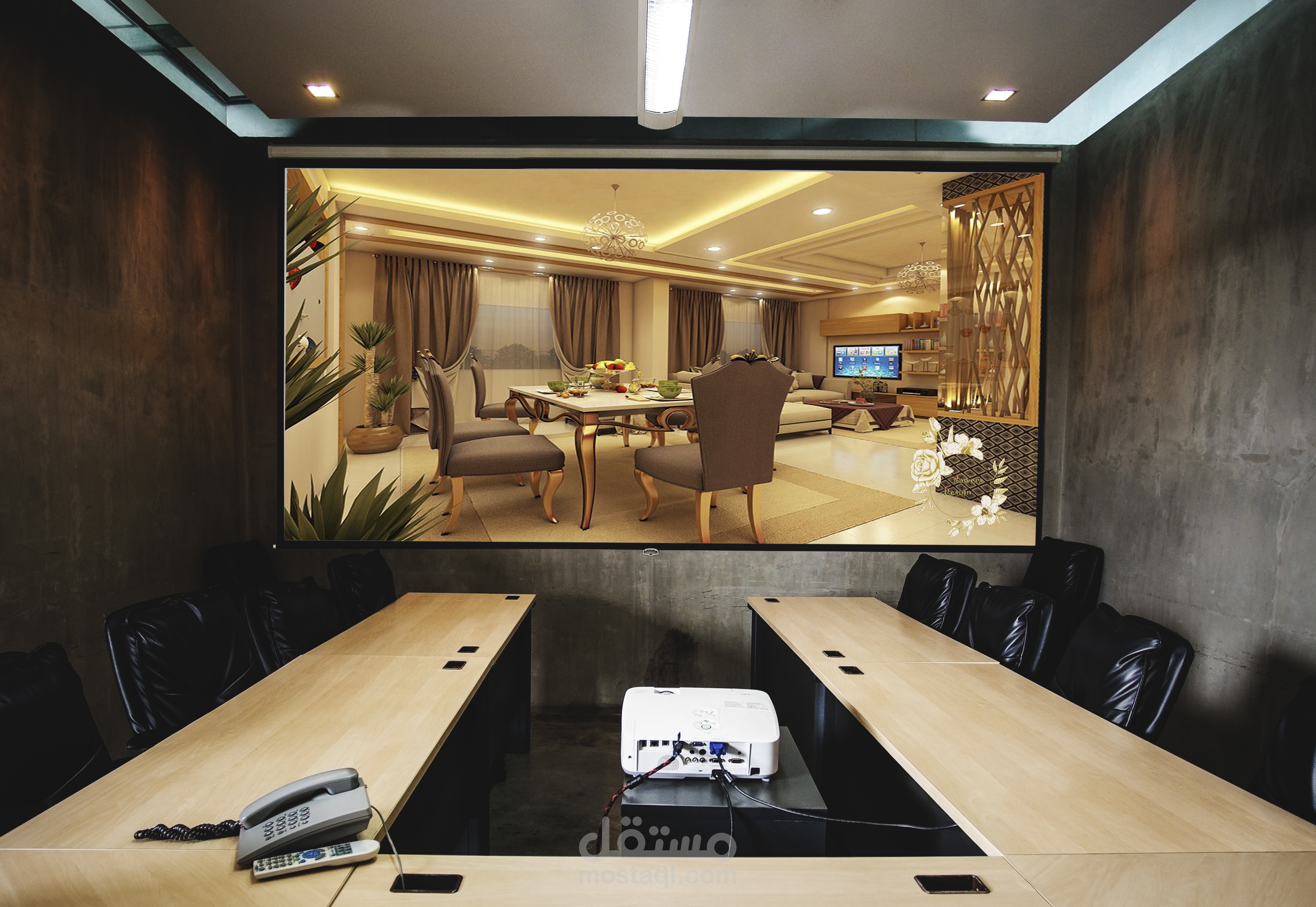 تصميم داخلي يمثل غرفة معيشة بطريقة معاصرة وإختيار الألوان المناسبة لها .