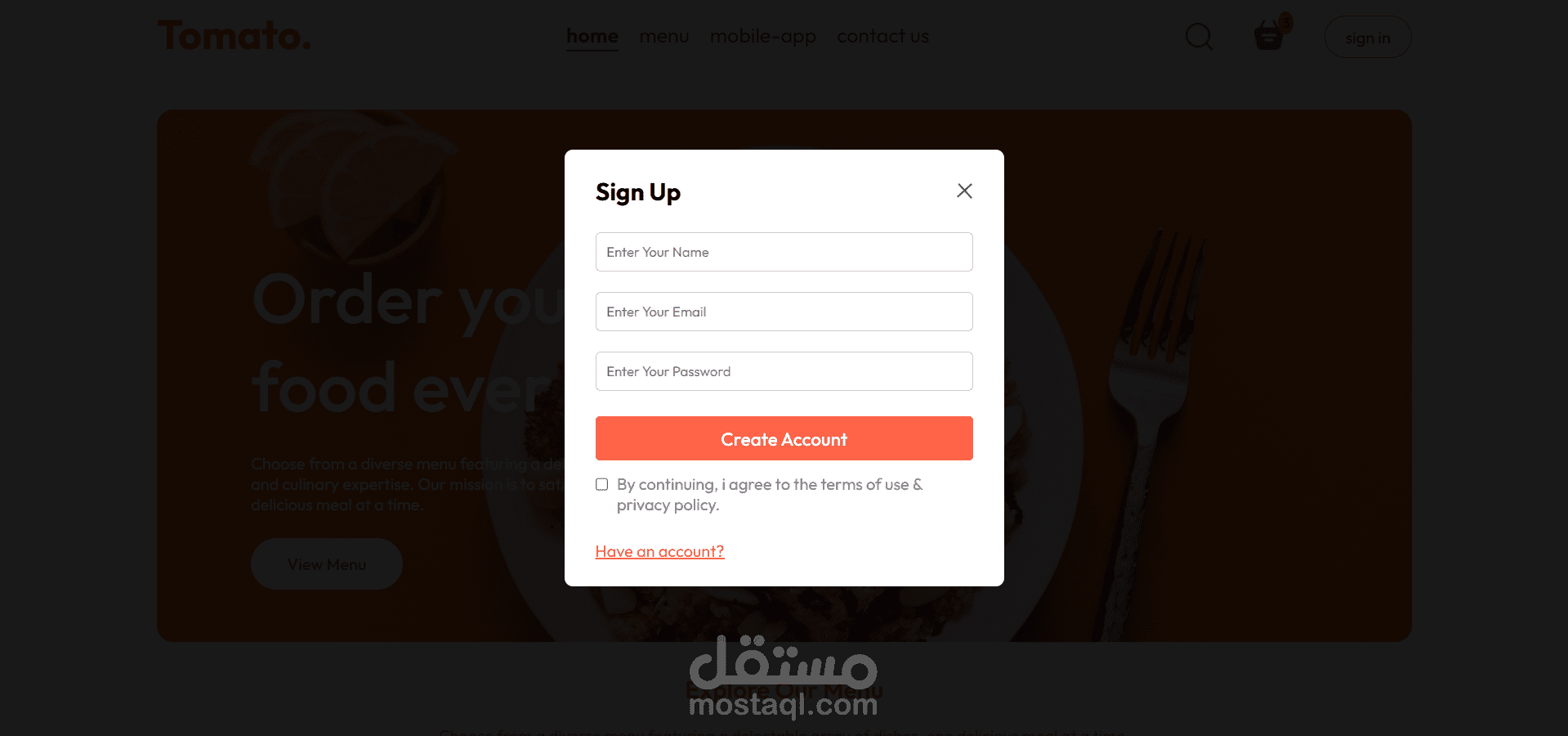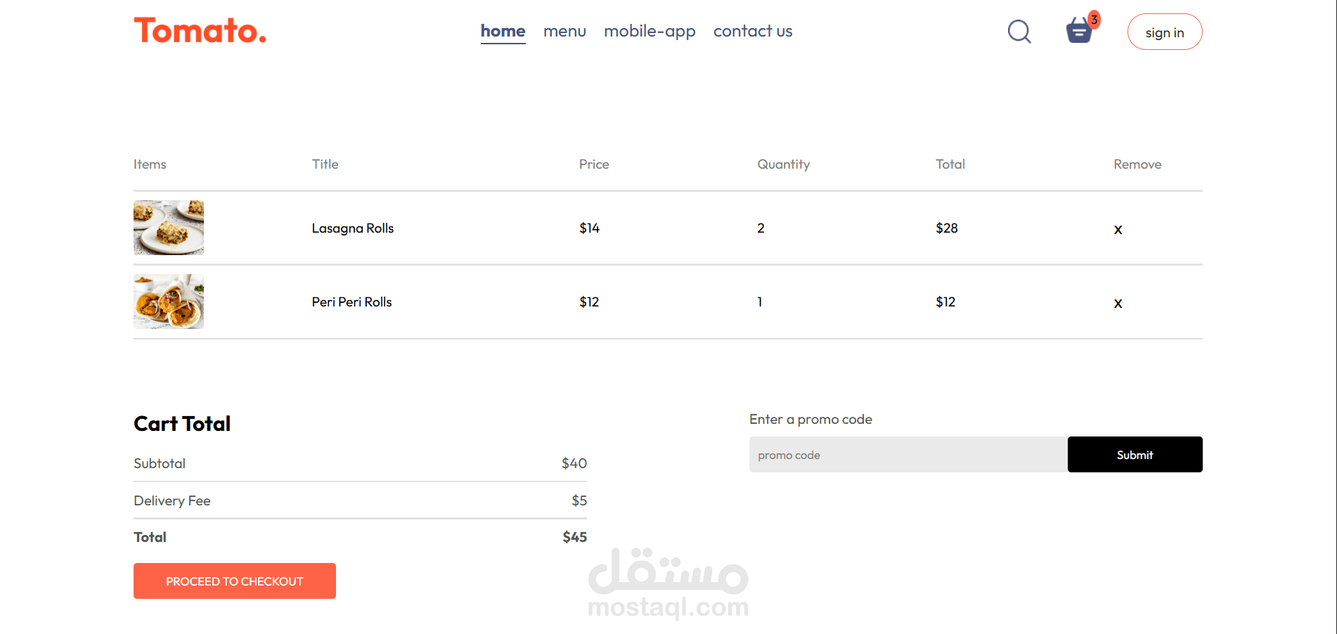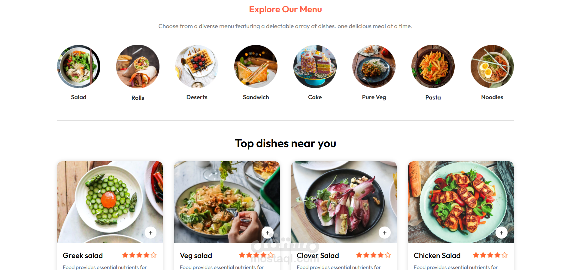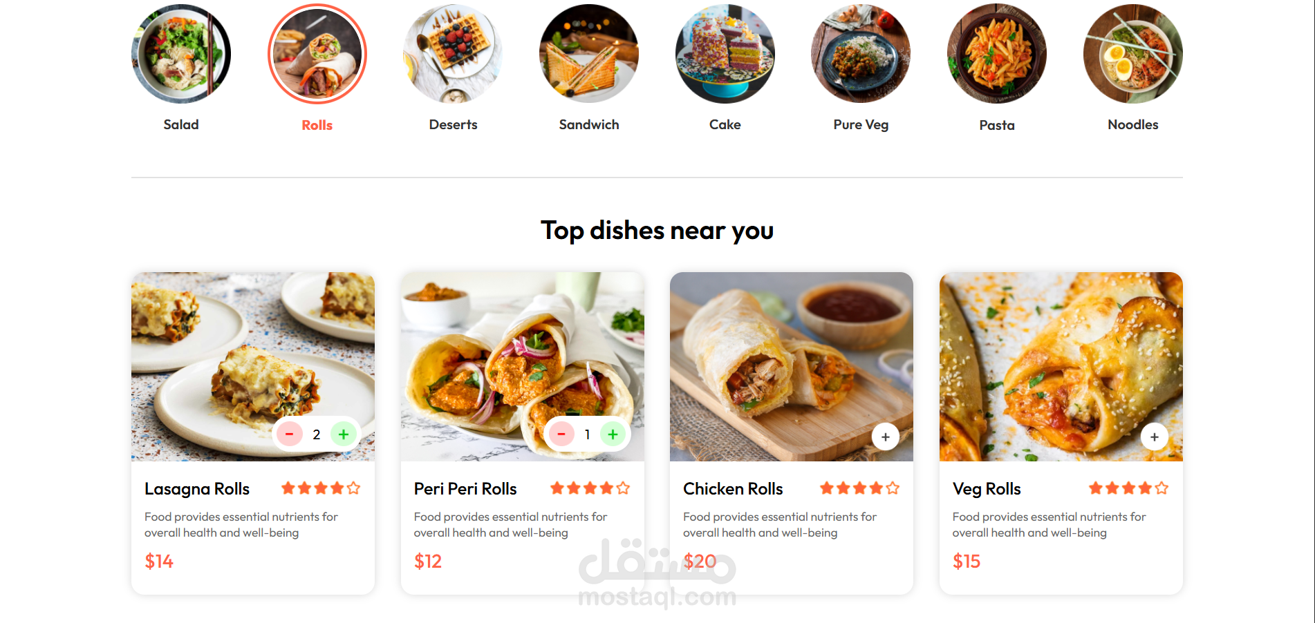 مشروعي هو موقع إلكتروني لمطعم يتيح للمستخدمين تصفح قائمة الطعام بسهولة، مع إمكانية تصفية الأصناف حسب الفئة المطلوبة. يمكن للمستخدم إضافة الأطعمة إلى عربة التسوق، عرض محتوياتها، وحساب التكلفة النهائية.