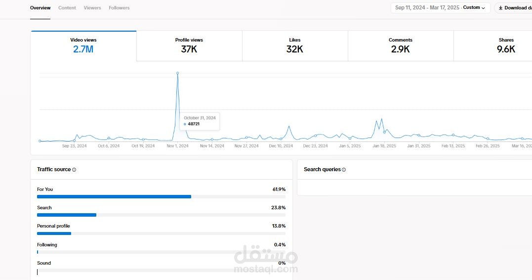 13-العمل على نشر المحتوى على منصات التواصل الاجتماعى مثل التيك توك والانستا وتويتر ، وتم الوصول إلى 2 مليون و 700 ألف مشاهدة بميزانية لا تتعدى 700 ريال سعودى ، لأن الأعتماد كان على نشر المحتوى بانتظام وتحسين السيو للفيديوهات .