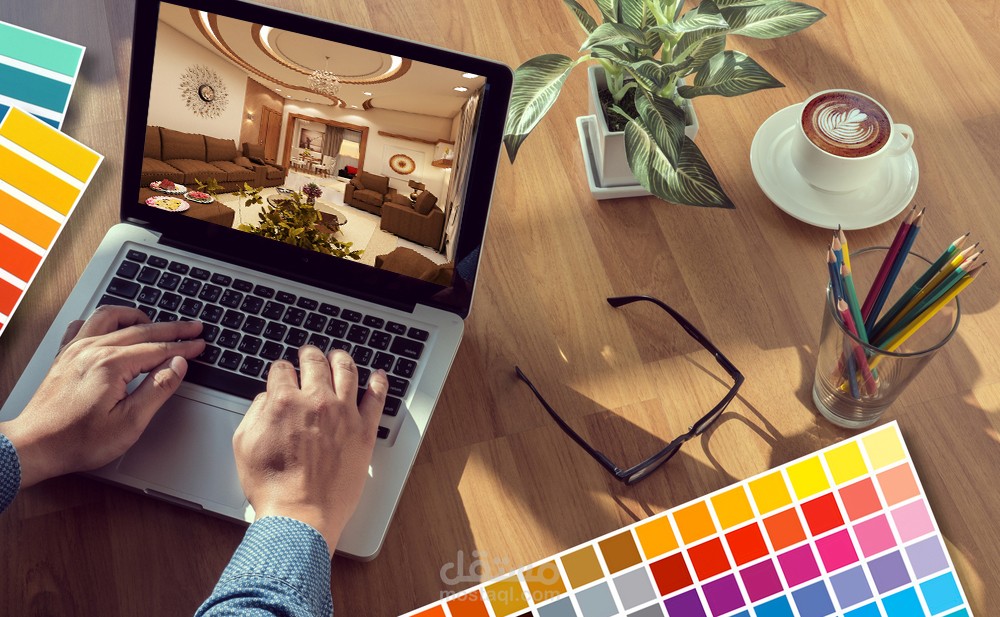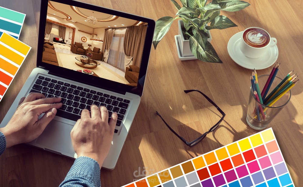 تصميم داخلي يمثل غرفة معيشة بطريقة معاصرة وإختيار الألوان المناسبة لها .