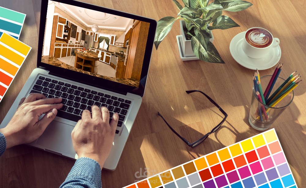 تصميم داخلي يمثل مطبخ بطريقة معاصرة وإختيار الألوان المناسبة لها .
