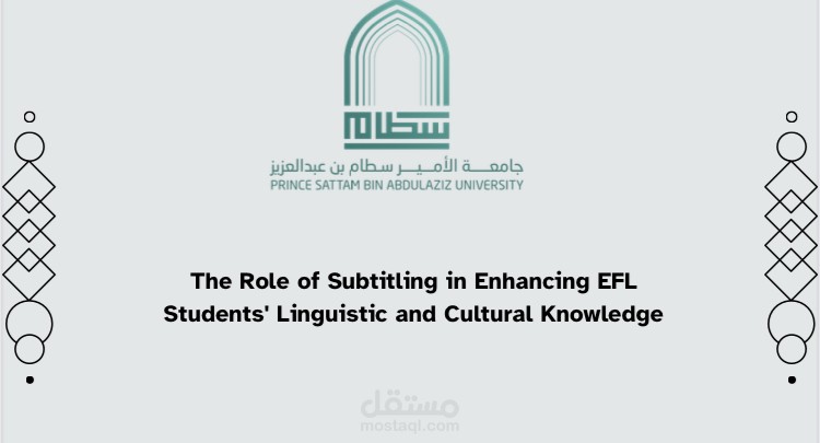 عرض تقديمي باللغة الإنجليزية لمناقشة بحث تخرج جامعي عن الترجمة السمعبصرية وأهميتها في إثراء المعرفة اللغوية والثقافية لدى الطلاب دارسي اللغة الإنجليزية كلغة ثانية.