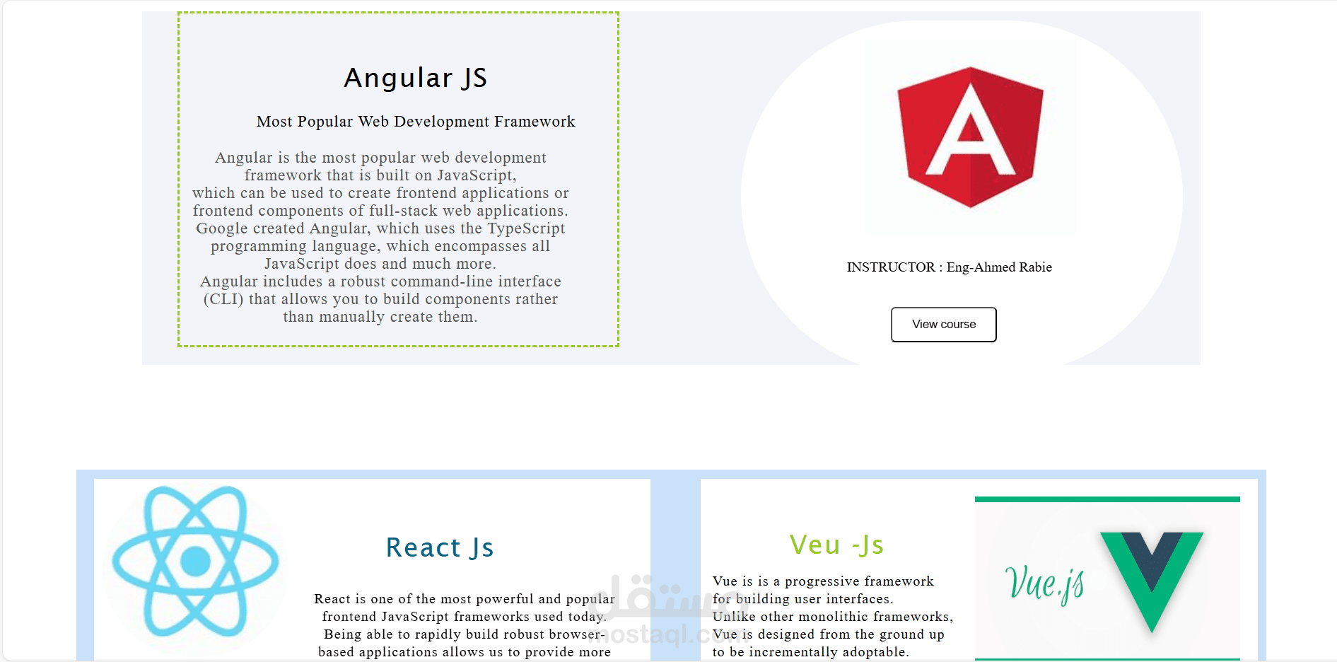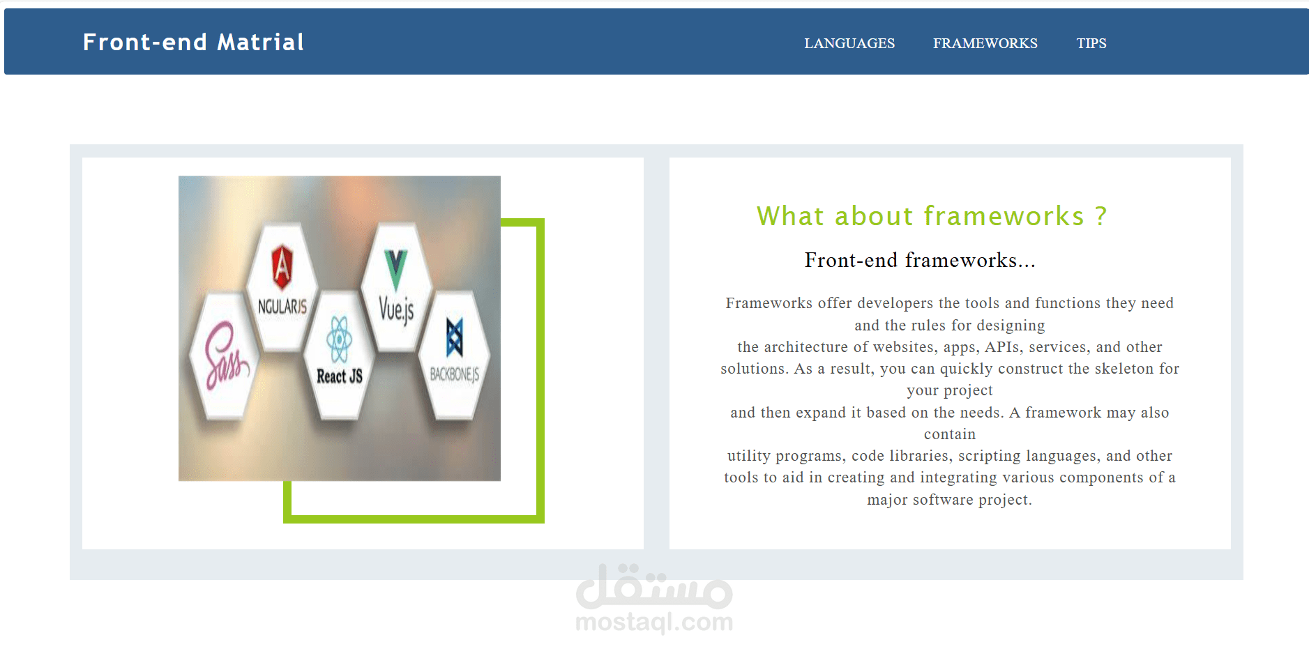 Materials for front-end . It consists of 3 pages : -The first page is an introduction and language resources -Second page for frameworks -The last page contains some useful tips in the field of programming
