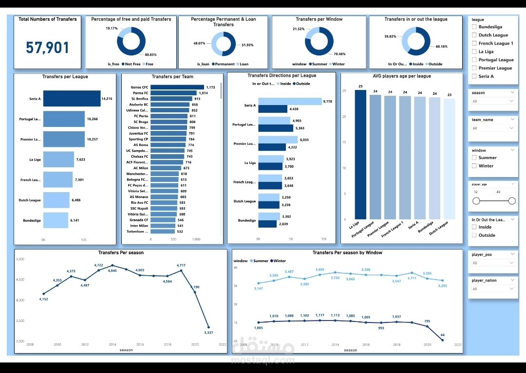 I used interactive charts and slicers to allow users to filter by league, team, transfer window, player age, and much more. You can deep dive into the transfer dynamics of your favorite teams or leagues, exploring trends and strategies behind player transfers.