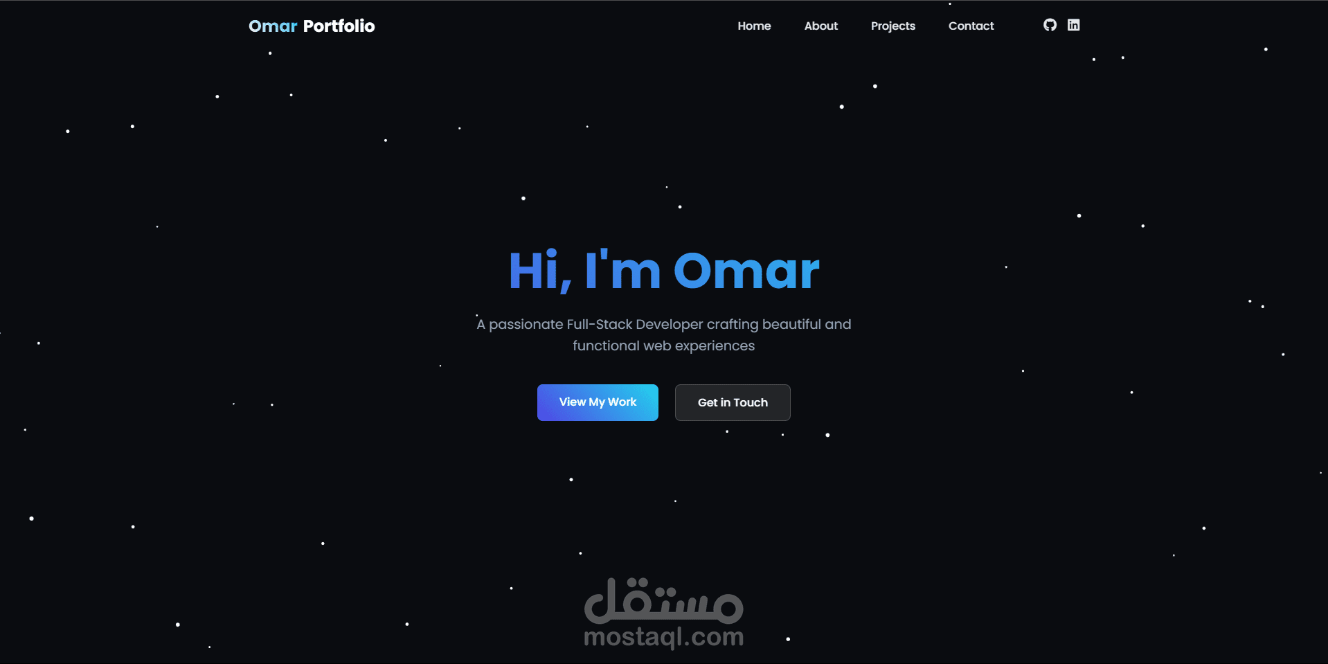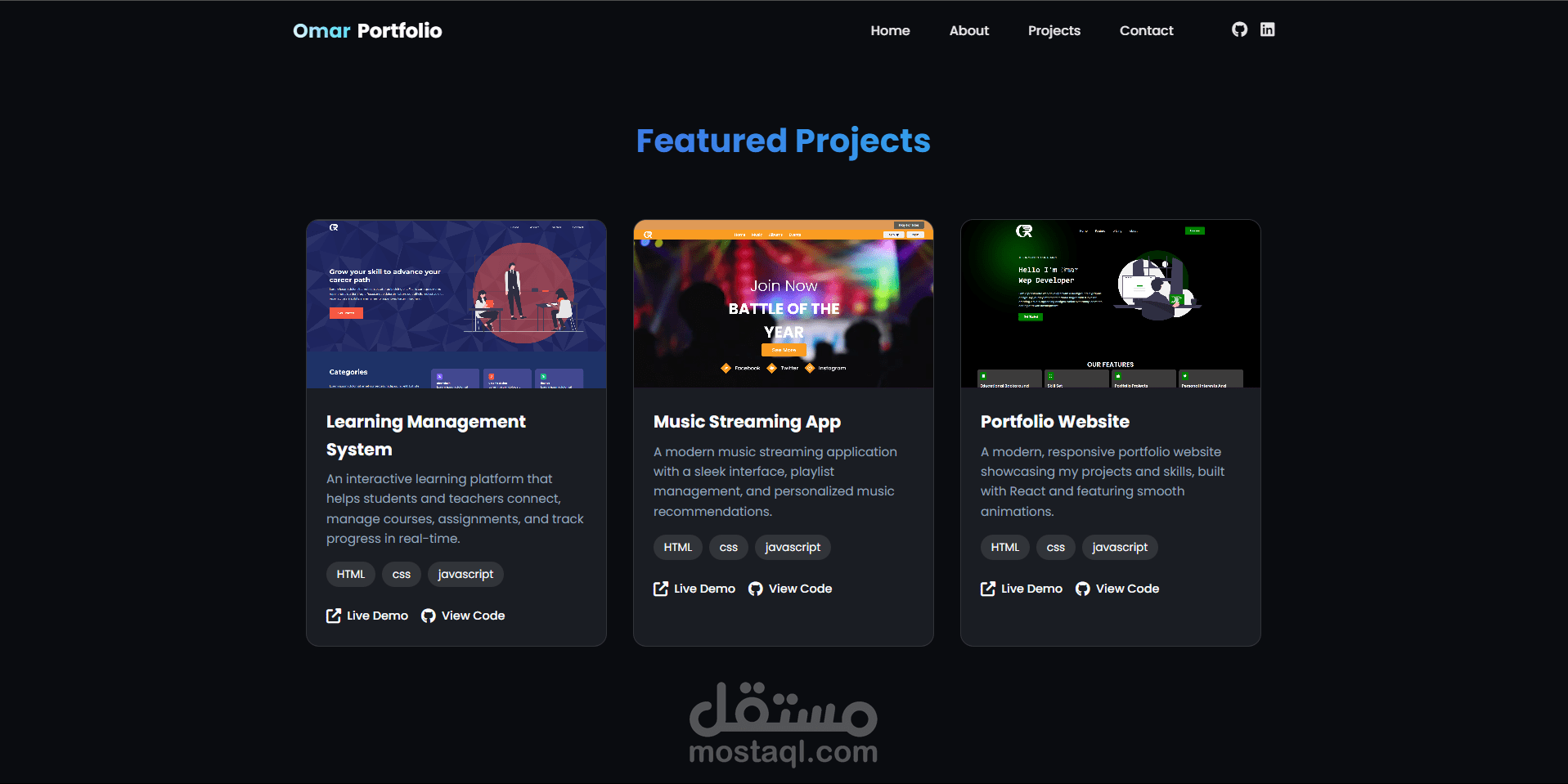 تجربة مستخدم سلسة وسهلة التصفح عبر أقسام واضحة (الرئيسية - عني - المشاريع - التواصل).