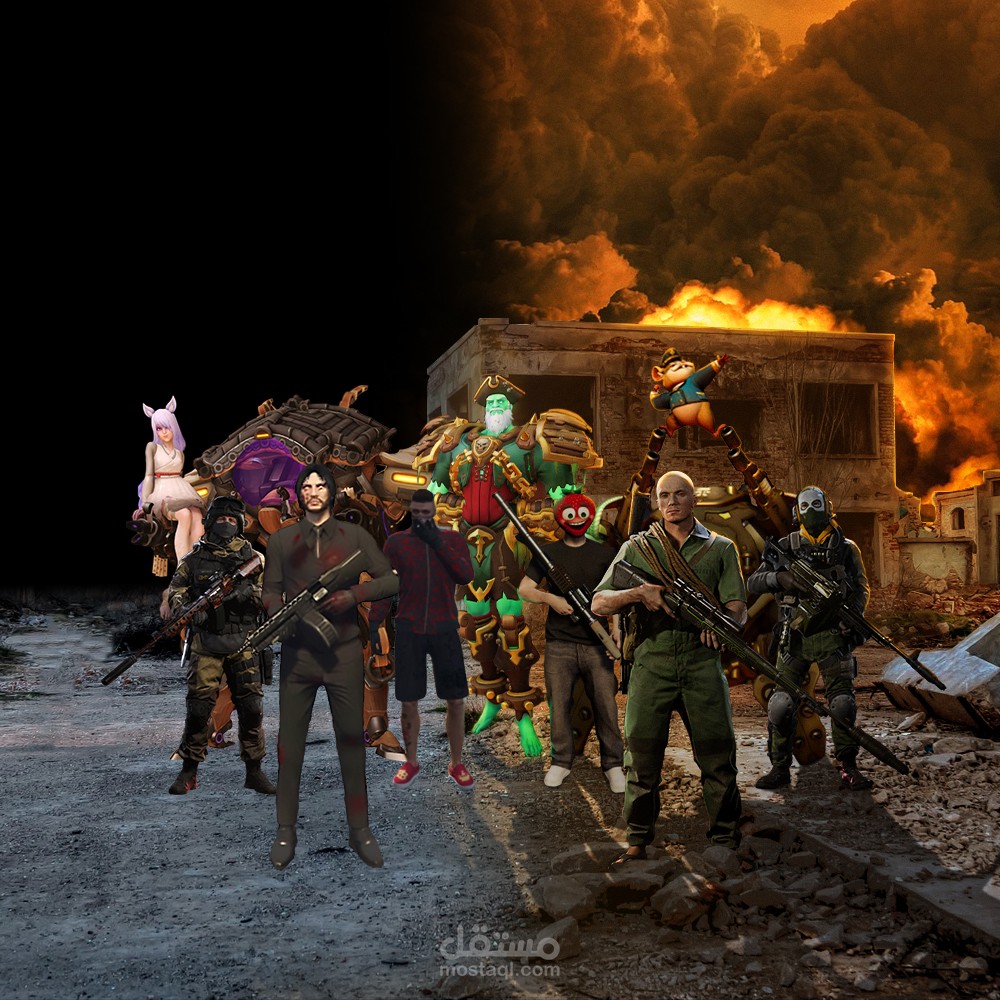 صورة عبارة عن فريق مكون من شخصيات العاب مختلفة مثل, overwatch, gta 5, call of duty. تم تصميمه لفريق gaming و الشخصيات المستخدمة في الصورة هم شخصيات الفريق في تلك الاعاب