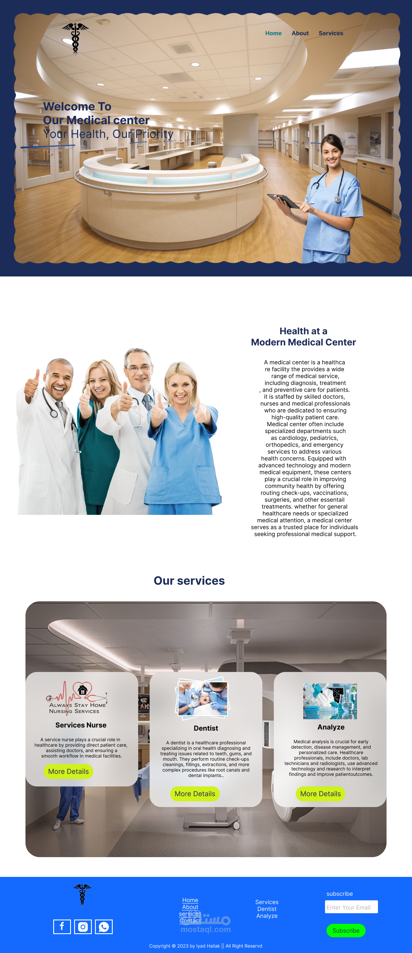 موقع المركز الطبي مصمم لتقديم خدمات طبية شاملة مع التركيز على راحة المريض وسهولة الوصول إلى المعلومات. يعكس الموقع المهنية والثقة من خلال تصميم نظيف وواضح، مع إبراز الخدمات الطبية المتنوعة.