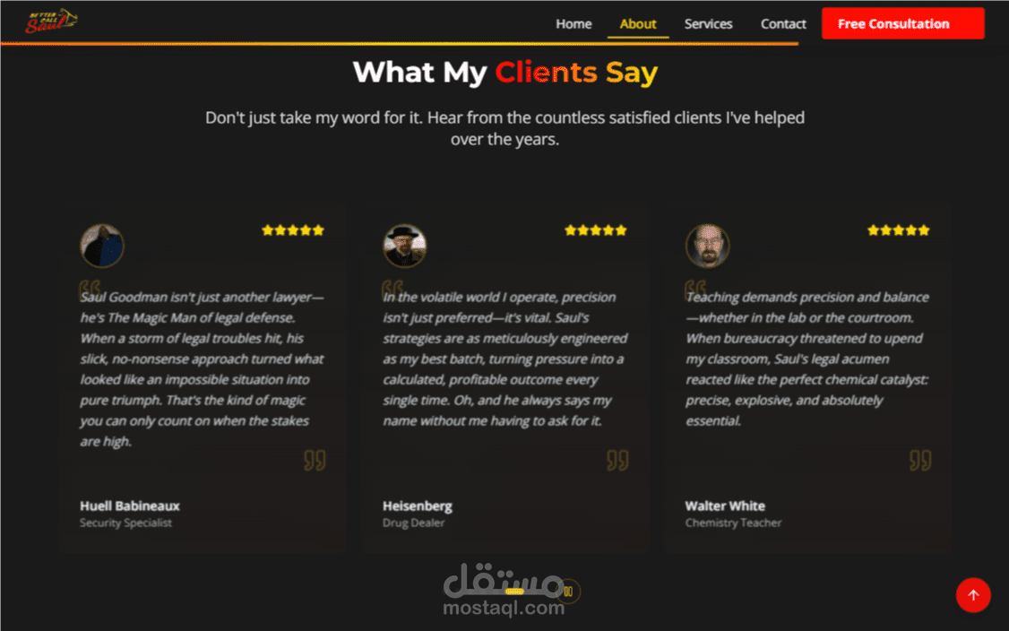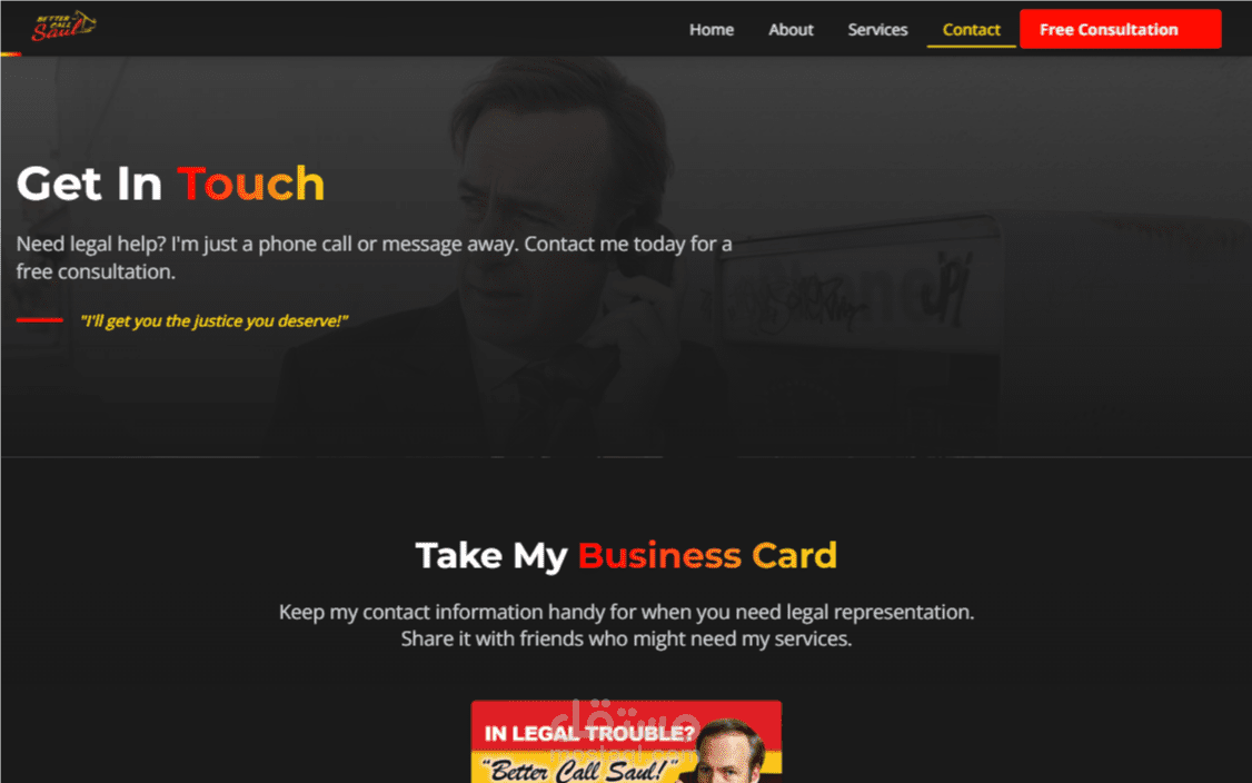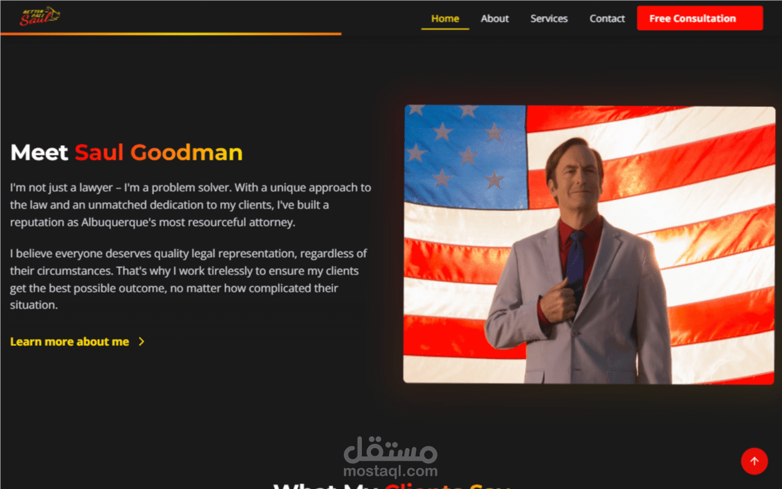 قمت بتصميم وتطوير موقع محفظة رقمية حديثة مستوحاة من شخصية سول غودمان، المحامي الأيقوني من مسلسل Better Call Saul. يتميز الموقع بتصميم احترافي يتماشى مع أسلوب الشخصية، حيث اعتمدت على ألوانه الشهيرة (الأحمر والأصفر)، مع حركات سلسة، قوائم ديناميكية، وتفاعل مميز للمستخدمين، مما يمنح تجربة تصفح فريدة ومميزة.