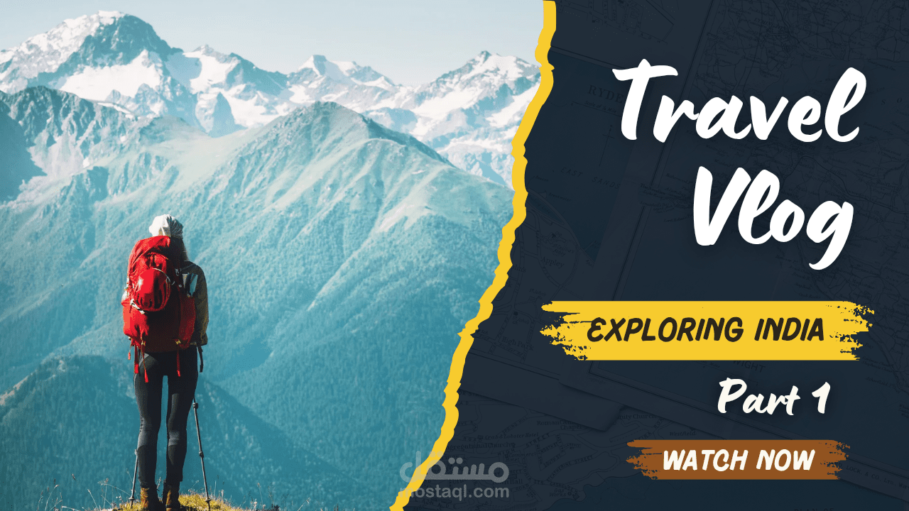 This thumbnail design combines adventure an bold typography to attract viewers. The left side features a high-resolution image of a hiker standing on a mountain ridge, creating a sense of exploration. The right side has a dark overlay with a torn-paper effect, enhancing contrast and drawing attention to the text. The title "Travel Vlog" is in a large, white, handwritten-style font, making it stand out. Below it, "Exploring India – Part 1" is highlighted in a brush-stroke effect, giving a rugged, travel-inspired feel. The "Watch Now" button in brown and yellow creates urgency and encourages.