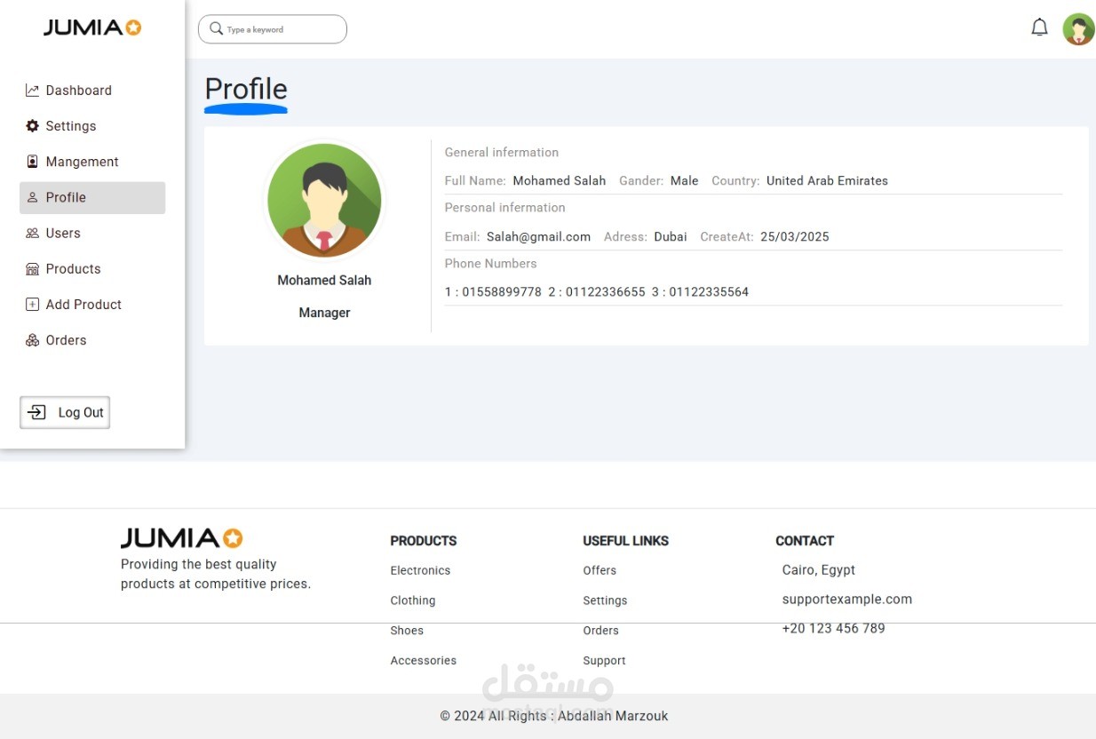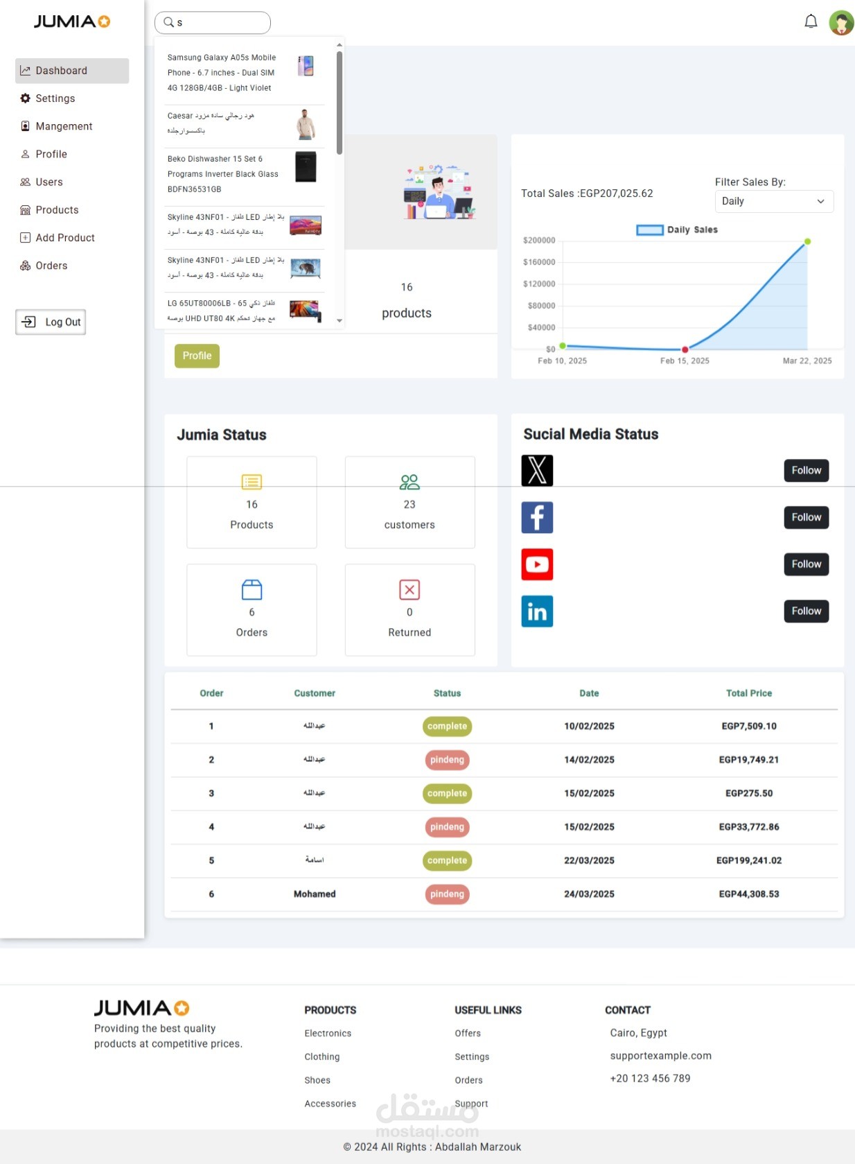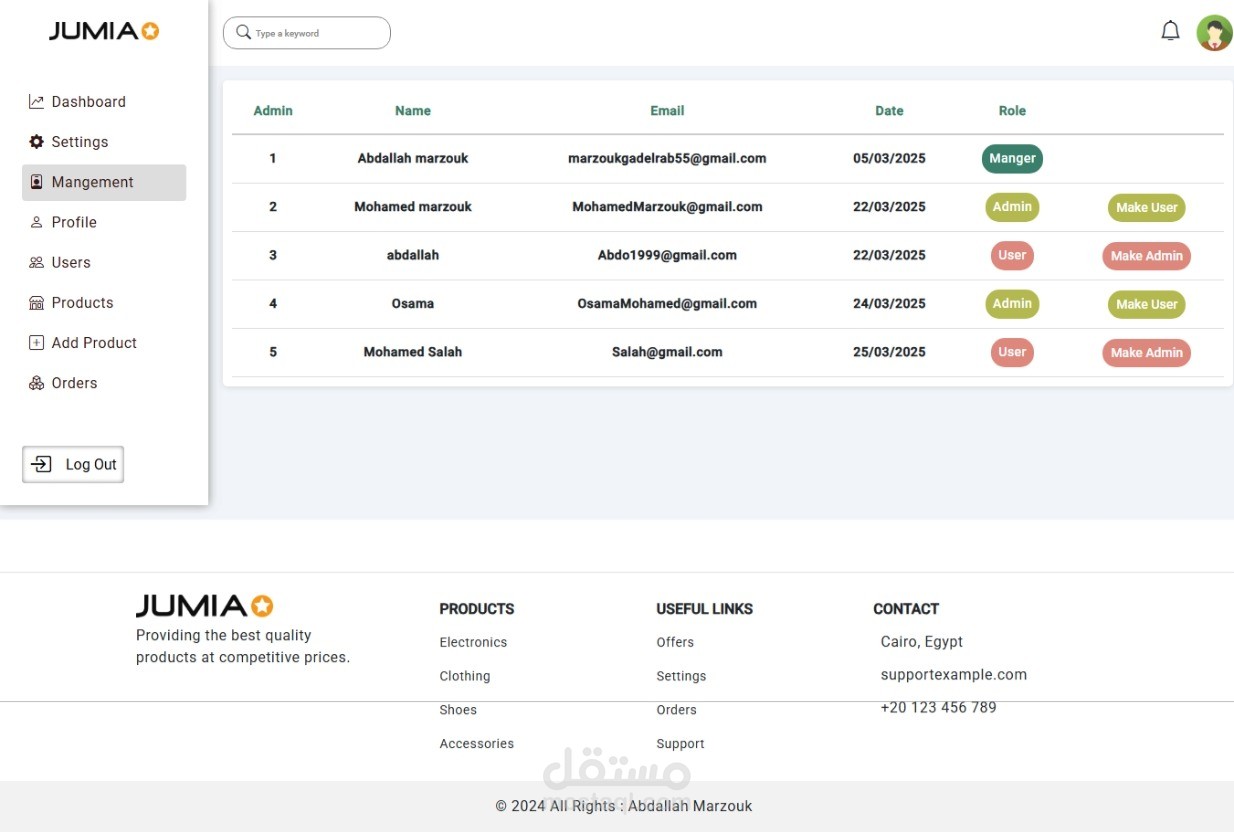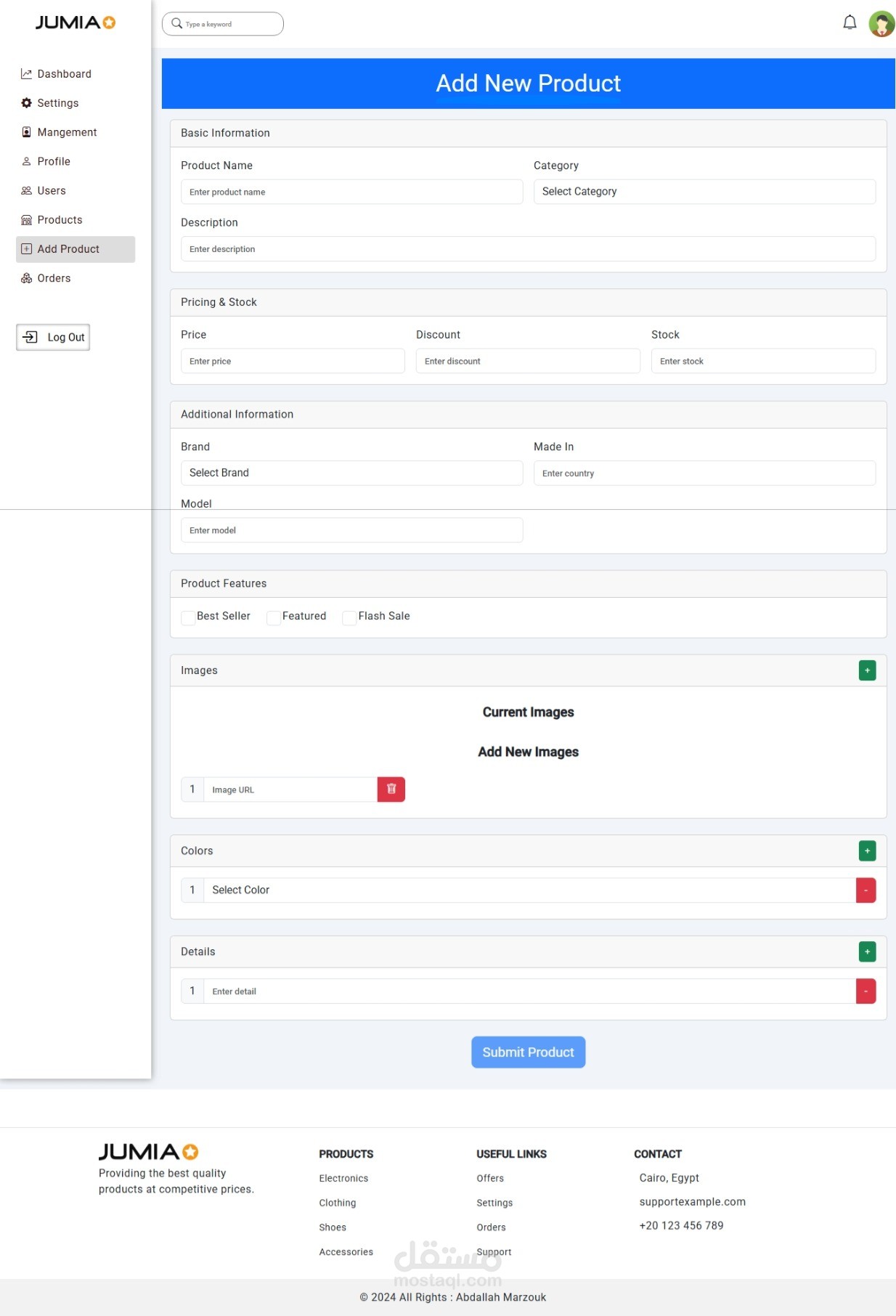 لوحة تحكم تفاعلية ومتجاوبة بالكامل مستوحاة من جوميا. المشروع يهدف إلى تحسين تجربة إدارة المنتجات والمستخدمين من خلال تصميم عصري وميزات متقدمة، بالإضافة إلى تعزيز الأمان والتحكم في الصلاحيات.