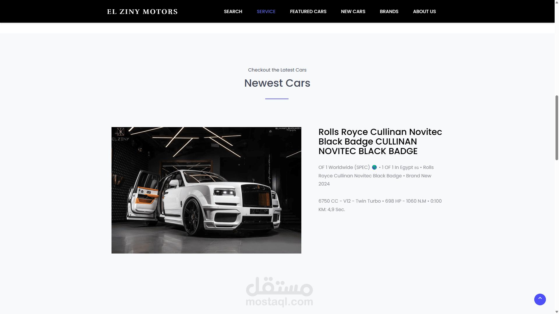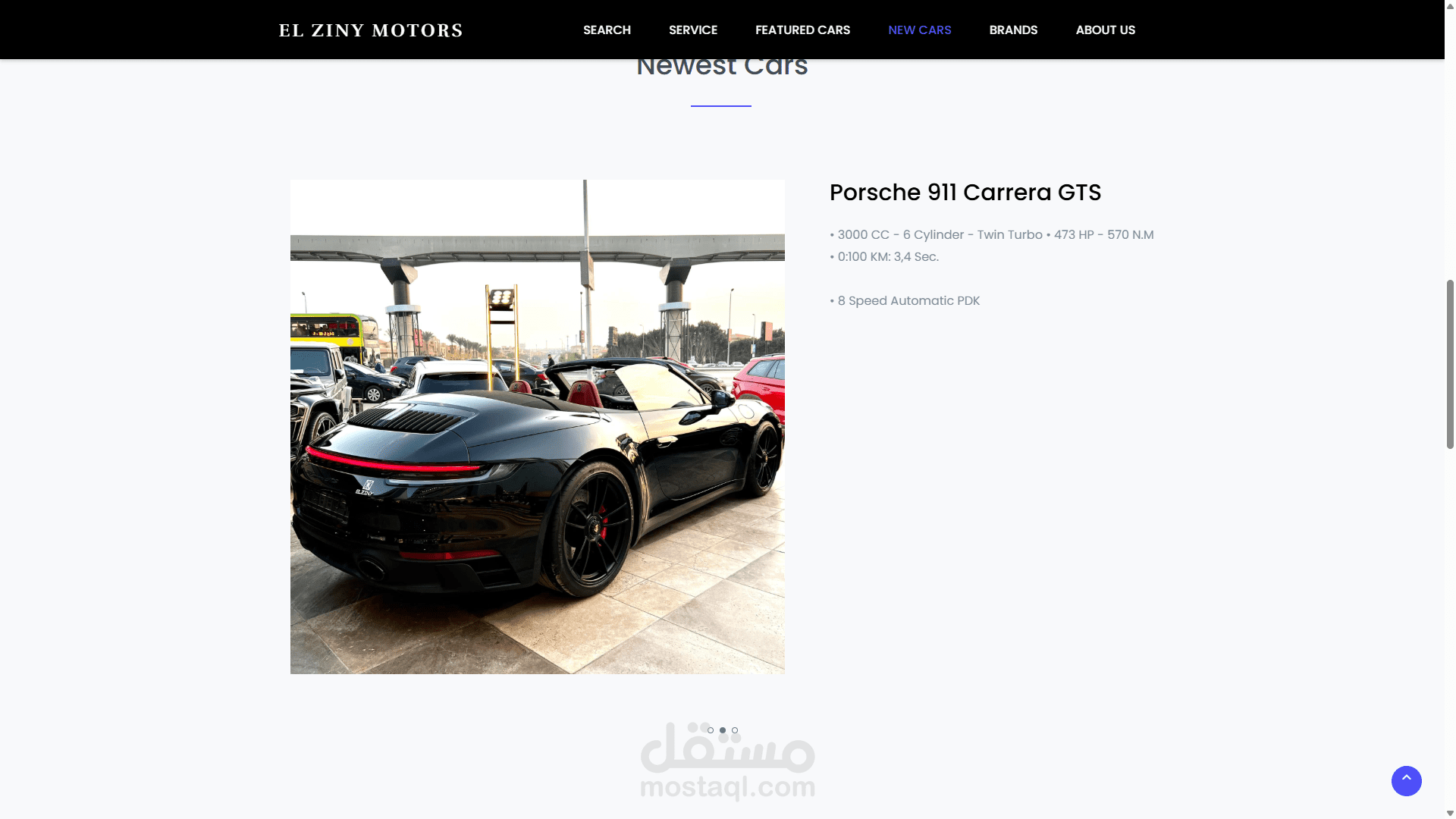 عروض سيارات حديثة: مثل رولز رويس كولينان نوفيتيك (Rolls Royce Cullinan Novitec) وبورش 911 كاريرا جي تي إس (Porsche 911 Carrera GTS) وفيراري F8 سبايدر كيفاني (Ferrari F8 Spider Keyvany)، مع تفاصيل دقيقة عن المواصفات (مثل سعة المحرك، القوة، ناقل الحركة الأوتوماتيكي).