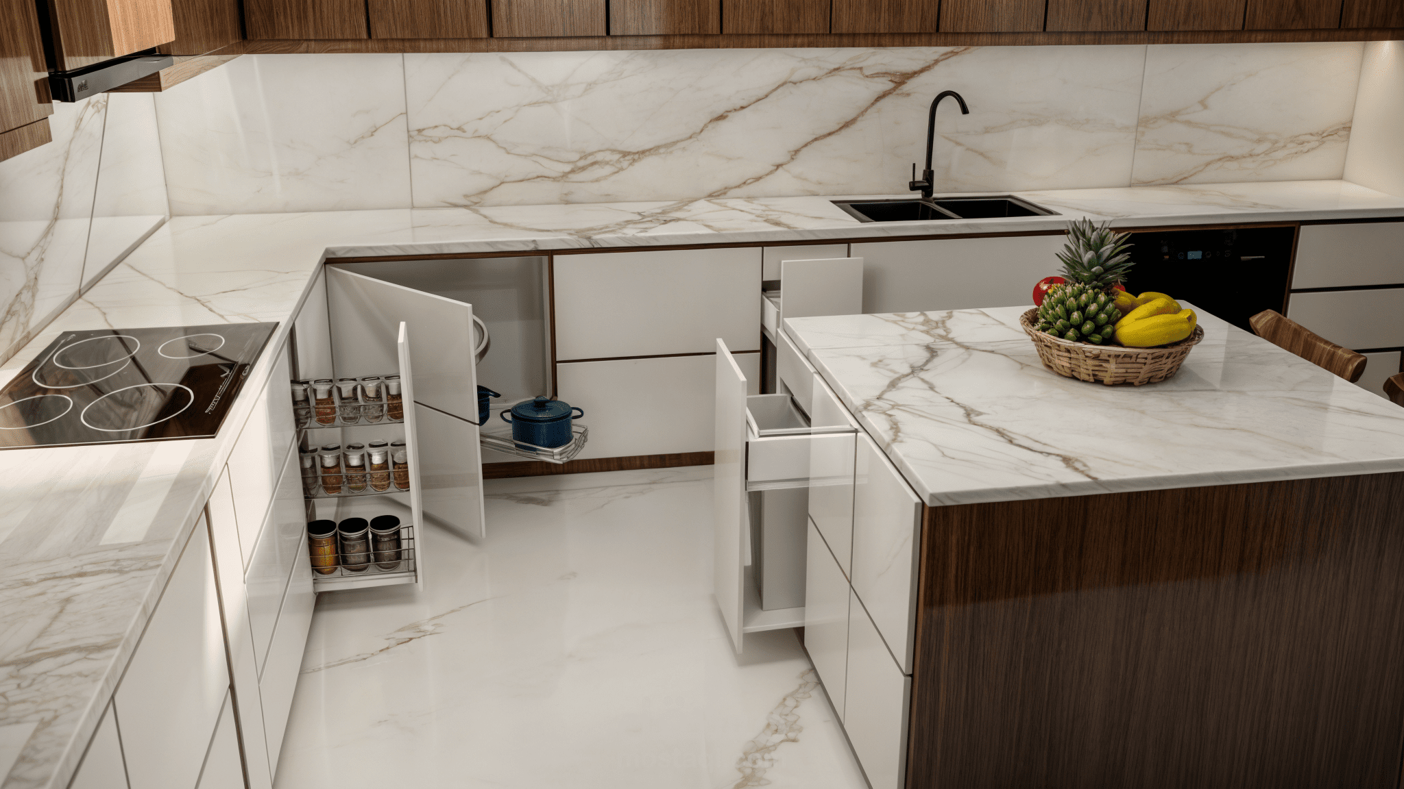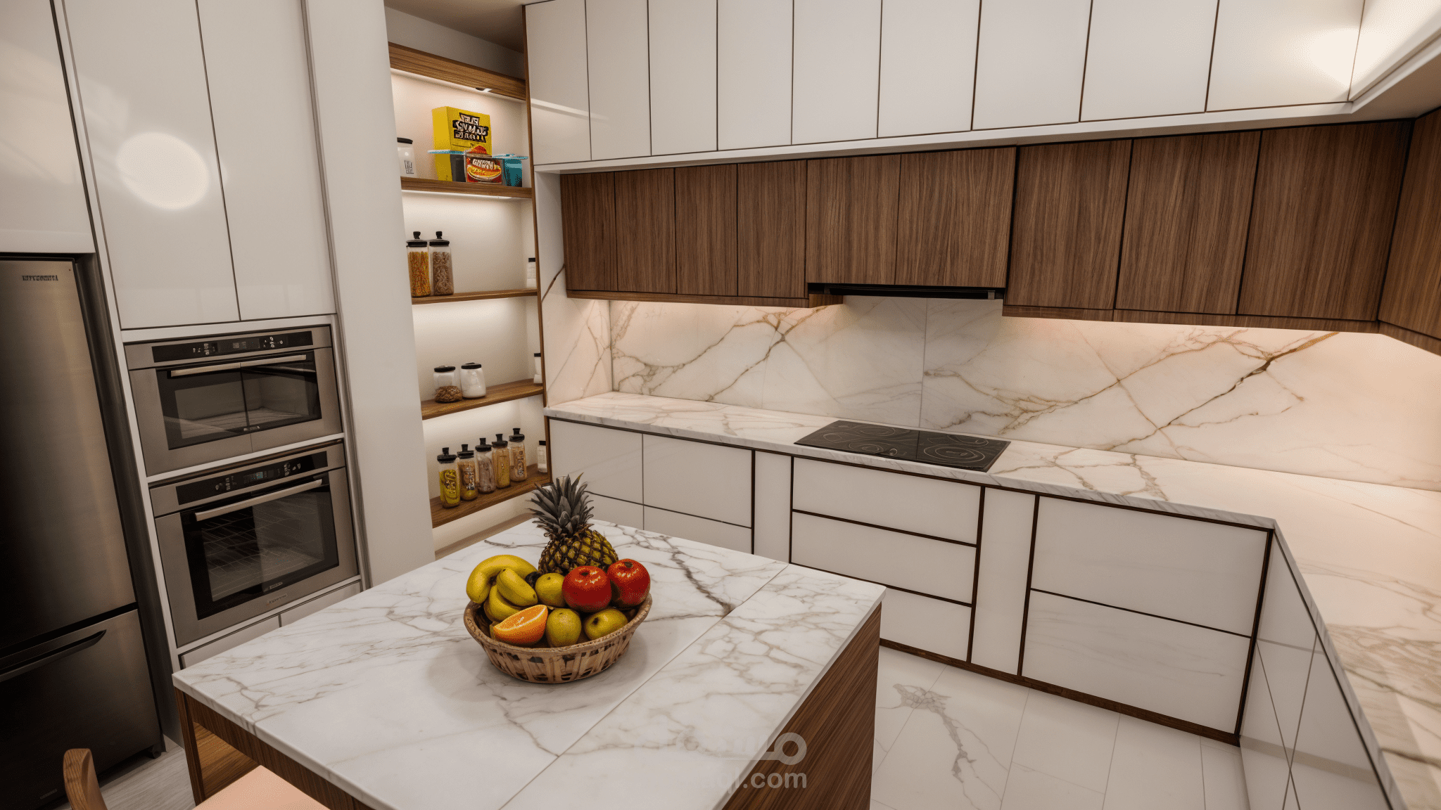 تصميم هذا المطبخ في السعودية يعتمد على مزج اللون الأبيض النقي مع لمسات من الخشب الطبيعي، مما يخلق بيئة حديثة وأنيقة. تم اختيار اللون الأبيض كأساس لخلق إحساس بالاتساع والنظافة، بينما يضفي الخشب دفئًا وراحة على المساحة. التصميم يتضمن جزيرة مركزية تضيف لمسة من الفخامة والوظيفية في آن واحد، حيث يمكن استخدامها كمكان لتحضير الطعام أو للجلوس والتفاعل مع العائلة أو الضيوف.