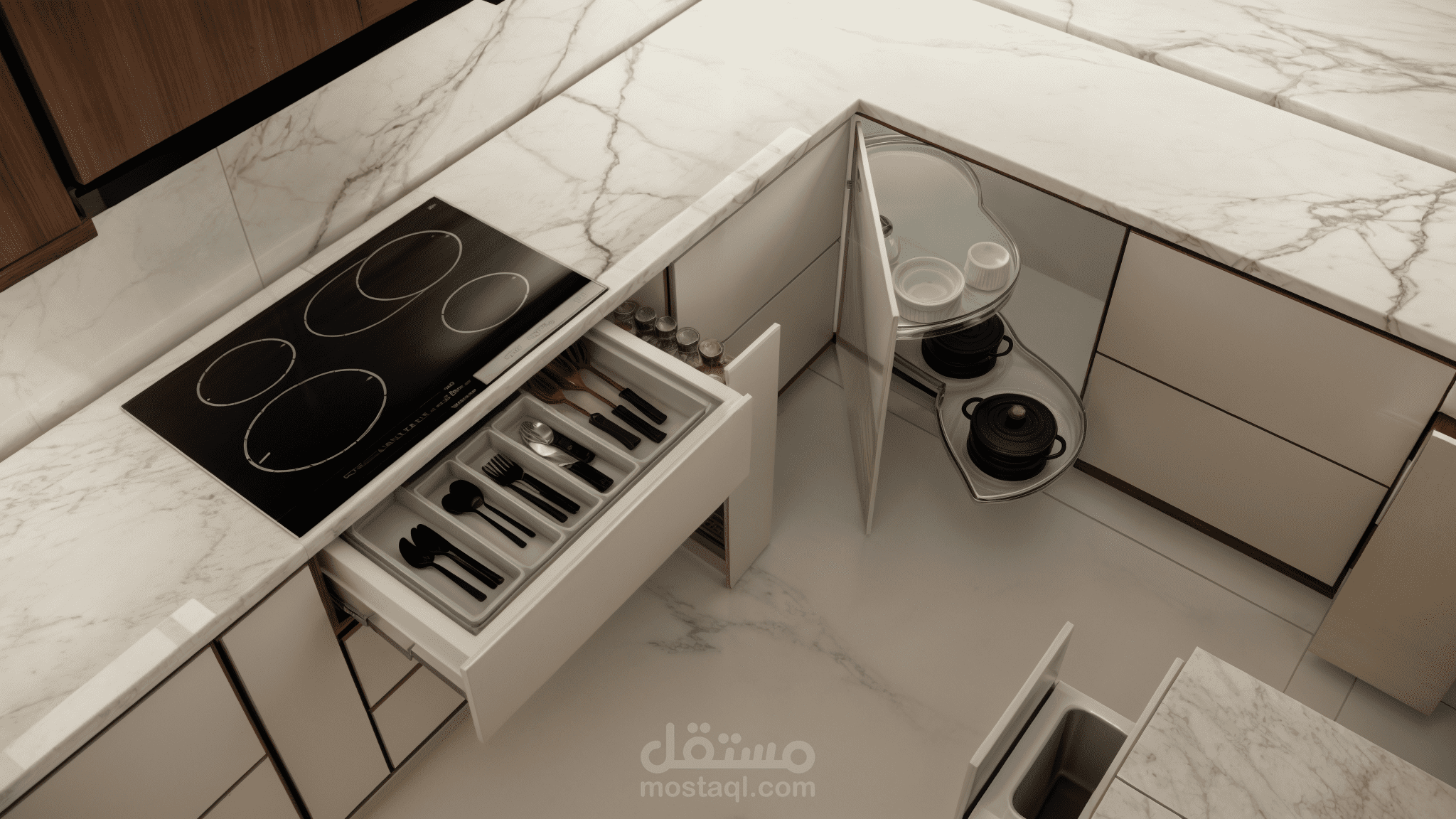 إضافة إلى ذلك، تم دمج خزائن ومستلزمات مطبخية بتصميم عصري بسيط ومتناسق، مع التركيز على الاستخدام الأمثل للمساحات. تُعد هذه المساحة مكانًا مثاليًا للعائلة، حيث تم تصميمها لتكون عملية وسهلة التنظيف، مع الحفاظ على أعلى معايير الجمال والوظائف.