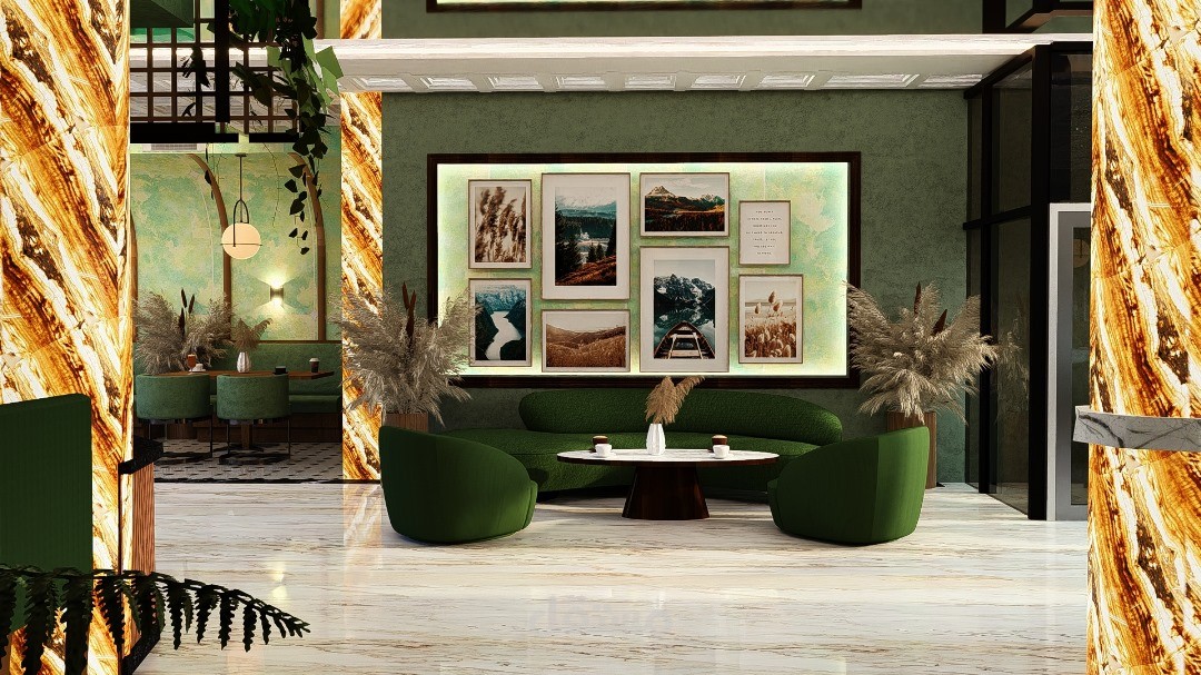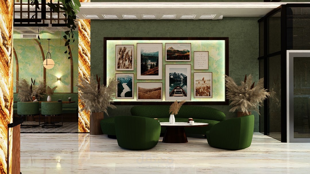 تعزز الألوان الخضراء واللمسات النباتية الإحساس بالحيوية والانتعاش، بينما تسهم المواد العازلة للصوت في خلق بيئة هادئة ومناسبة للمحادثات. كما يشمل التصميم مساحات متعددة تلائم مختلف الأنشطة، مثل القراءة، العمل المشترك، والاسترخاء.