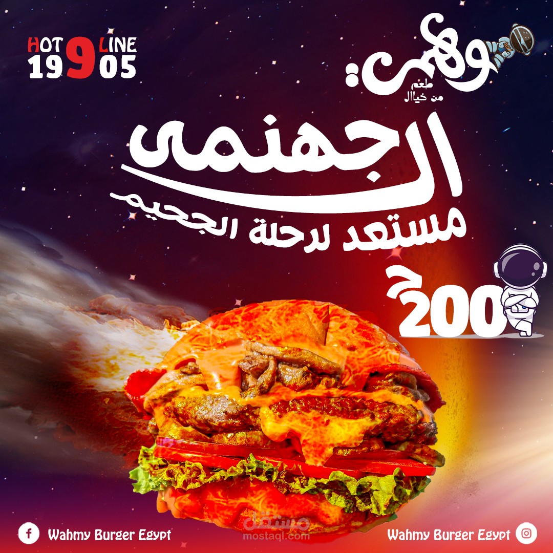 في هذا الإعلان الجريء، نقدم البرجر الأكثر سخونة على الإطلاق: الجهنمّي! تم تصميم الإعلان بخلفية مستوحاة من الفضاء المليء بالنجوم، مع تأثيرات نارية تضفي شعورًا بالحماسة والتحدي. العناصر المميزة في التصميم: شعار مطعم "وهمي" يظهر بجانب شخصية فضائية، مما يعكس طابعًا مبتكرًا وخياليًا. نص "الجهنمّي: مستعد لرحلة الجحيم" مكتوب بخط جذاب، مع تسليط الضوء على الجملة لجذب الانتباه. البرجر يظهر بتفاصيله المثيرة، مع مكونات غنية مثل الجبنة الذائبة واللحم المشوي، ما يجعله يبدو وكأنه قطعة من الجحيم اللذيذ! السعر مكتوب بشكل واضح وبجوار شخصية لطيفة تعزز من عنصر المرح