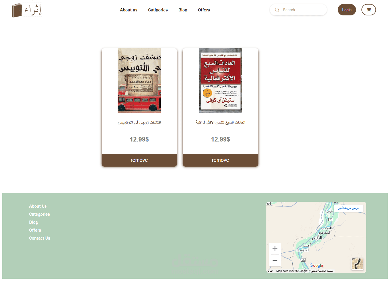2- صفحة عرض الكتب تحتوي على قائمة الكتب المتاحة مع صور وأسعار لكل كتاب.