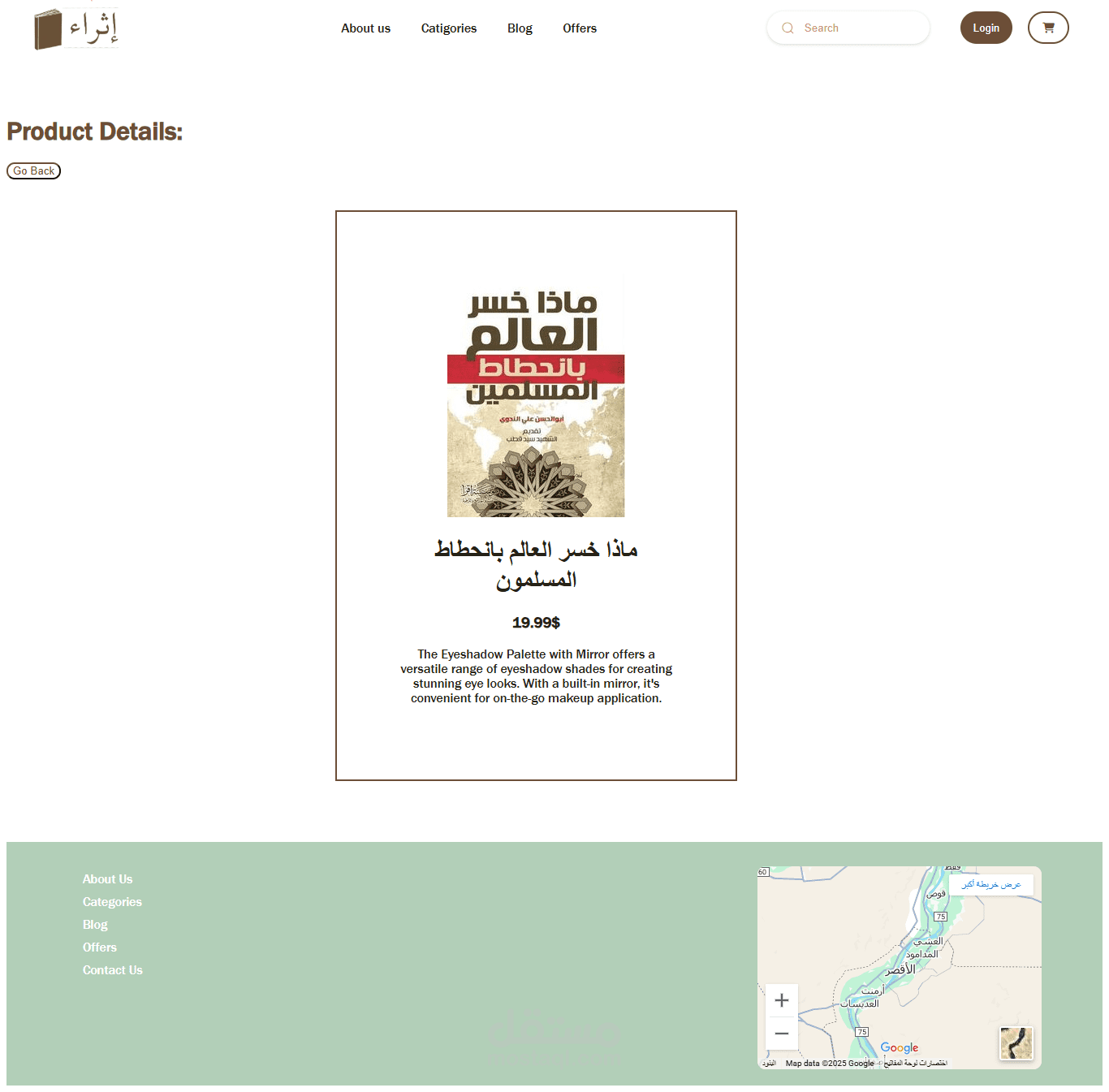 3- صفحة تفاصيل الكتاب تشمل وصفًا موجزًا، صورة الغلاف، السعر، وإمكانية إضافة الكتاب إلى عربة التسوق.
